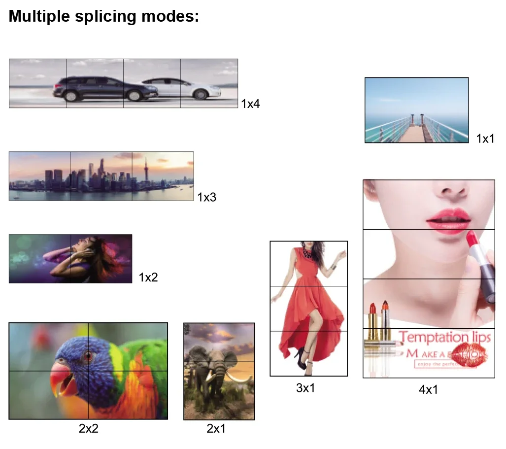 TV LCD, etc.), con 4 unidades de visualización de vídeo de alta definición HDMI para formar una gran pantalla de imagen dinámica.