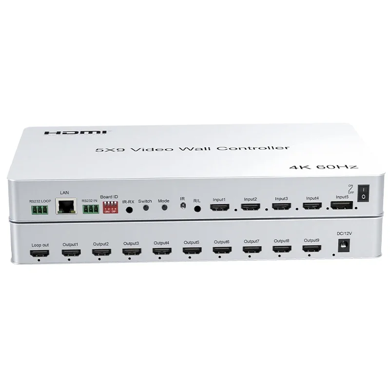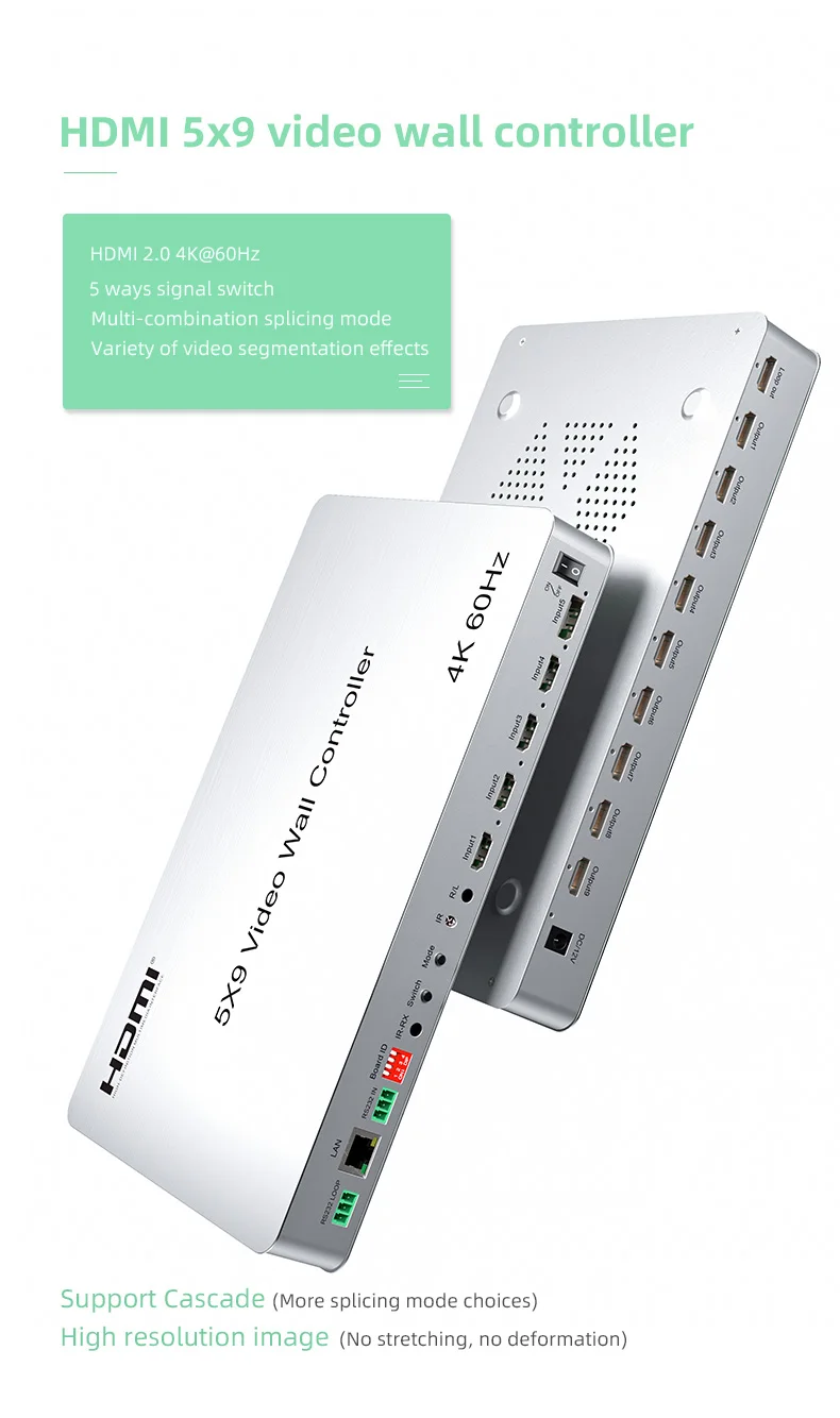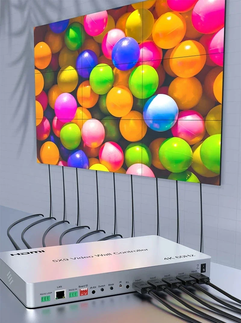 Este controlador de pared de video 5x9 admite entrada HDMI de 4 vías y entrada DP de 1 vía, salida HDMI de 10 vías, (empalme de 9 vías