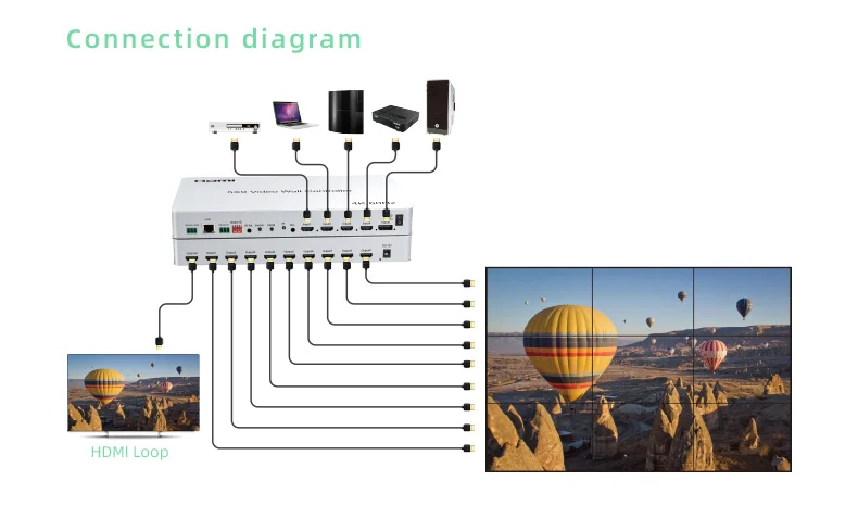 Con derivación local de 1 vía); la función principal es dividir una señal de imagen HD HDMI completa en 9 piezas y luego