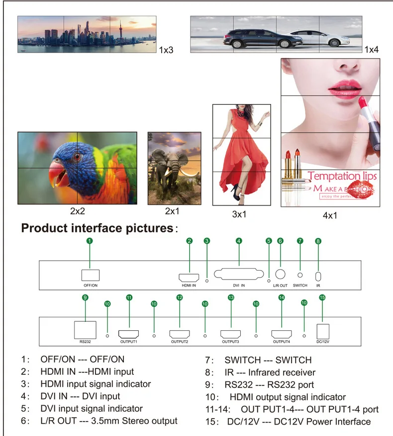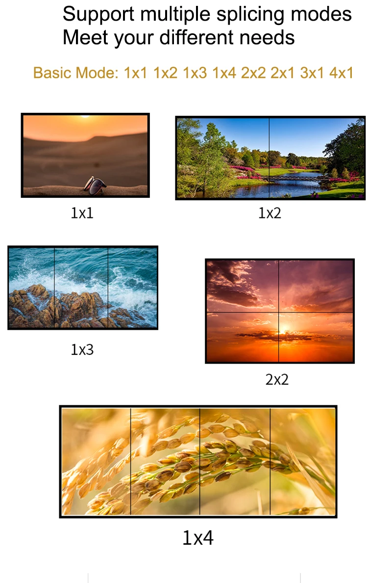 (2) El nuevo empalmador admite la composición 1x2, 2x2, 1x4 en una pantalla grande, salida de audio independiente, se puede conectar