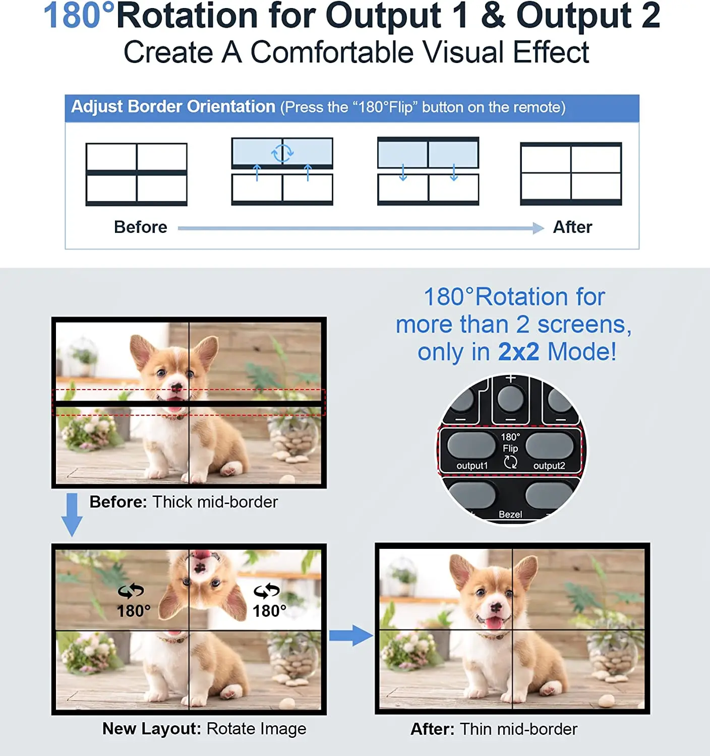 (5) Admite la función de rotación de 180 °, solo se ajusta al modo 2x2, la primera fila de 2 unidades de visualización puede girar 180 grados.