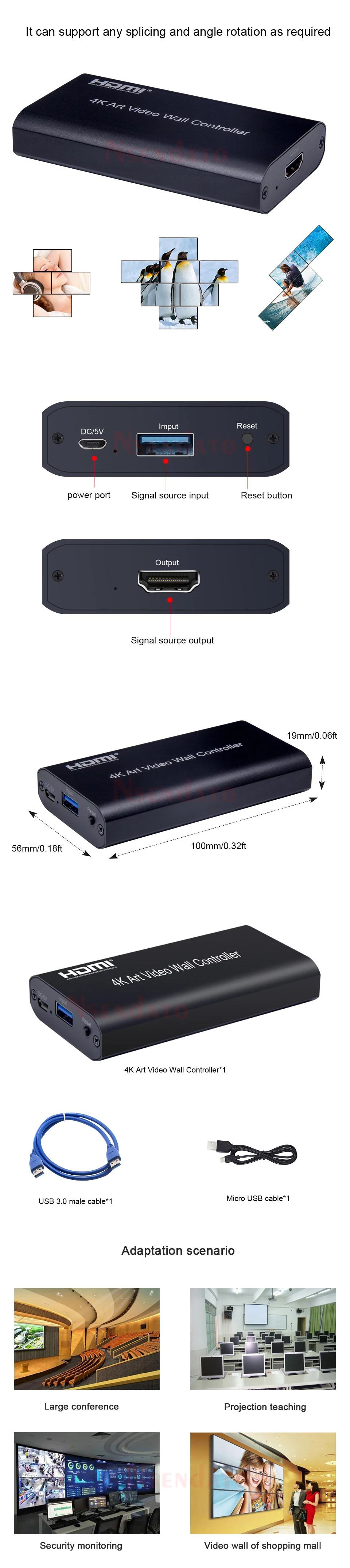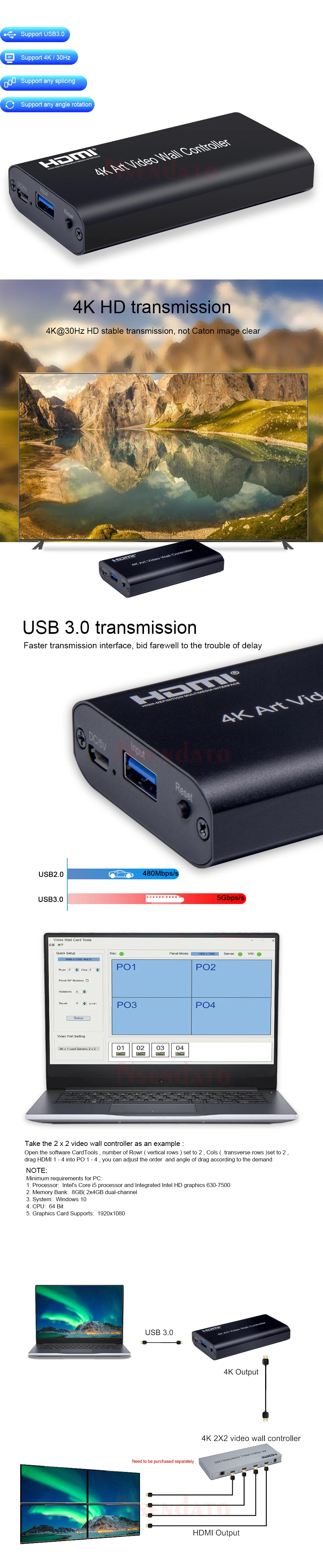 Este controlador de pared de Video de Arte 4K puede empujar el video desde el puerto USB 3,0 a múltiples pantallas para completar el empalme de todo el video. La resolución de la entrada del puerto USB 3,0 puede llegar hasta 4K y la salida de alta definición al monitor. Principalmente adecuado para la enseñanza, restaurantes, estaciones y otros lugares con pantalla de video.
