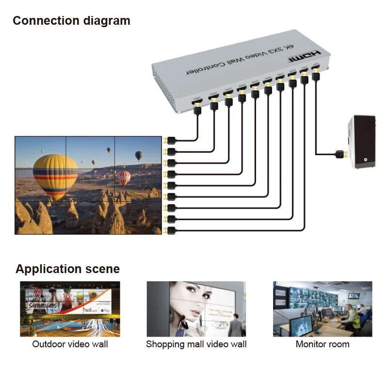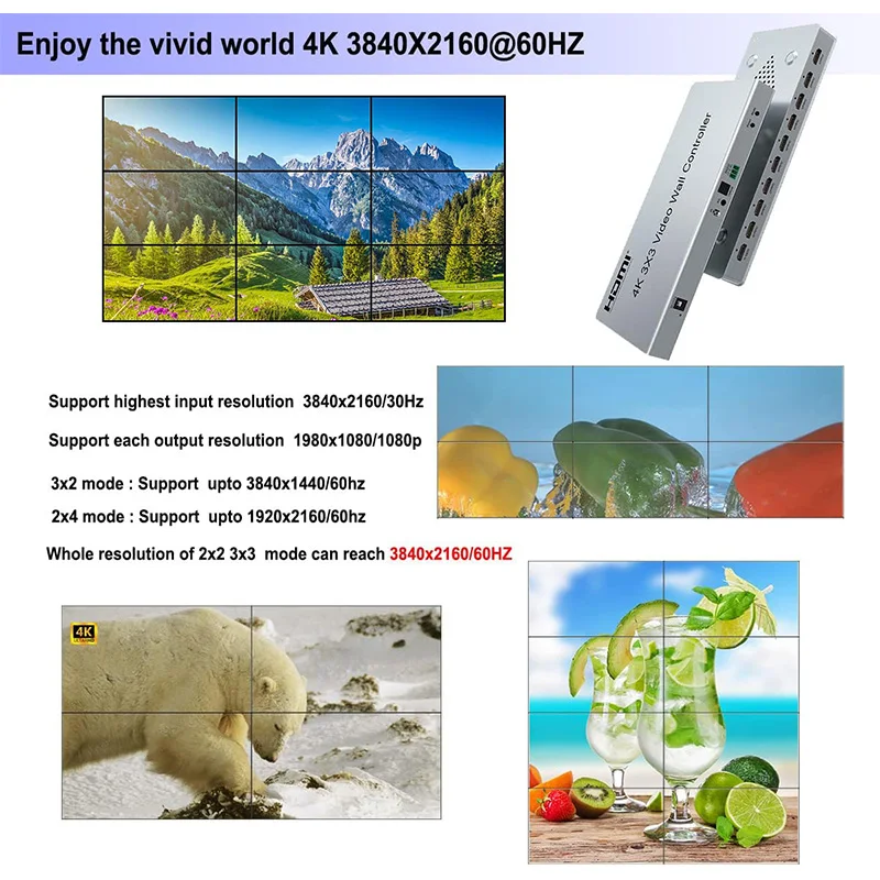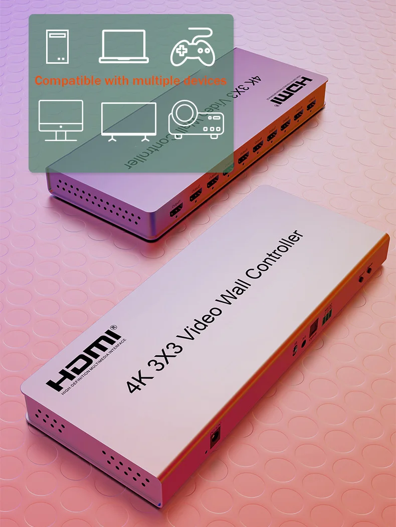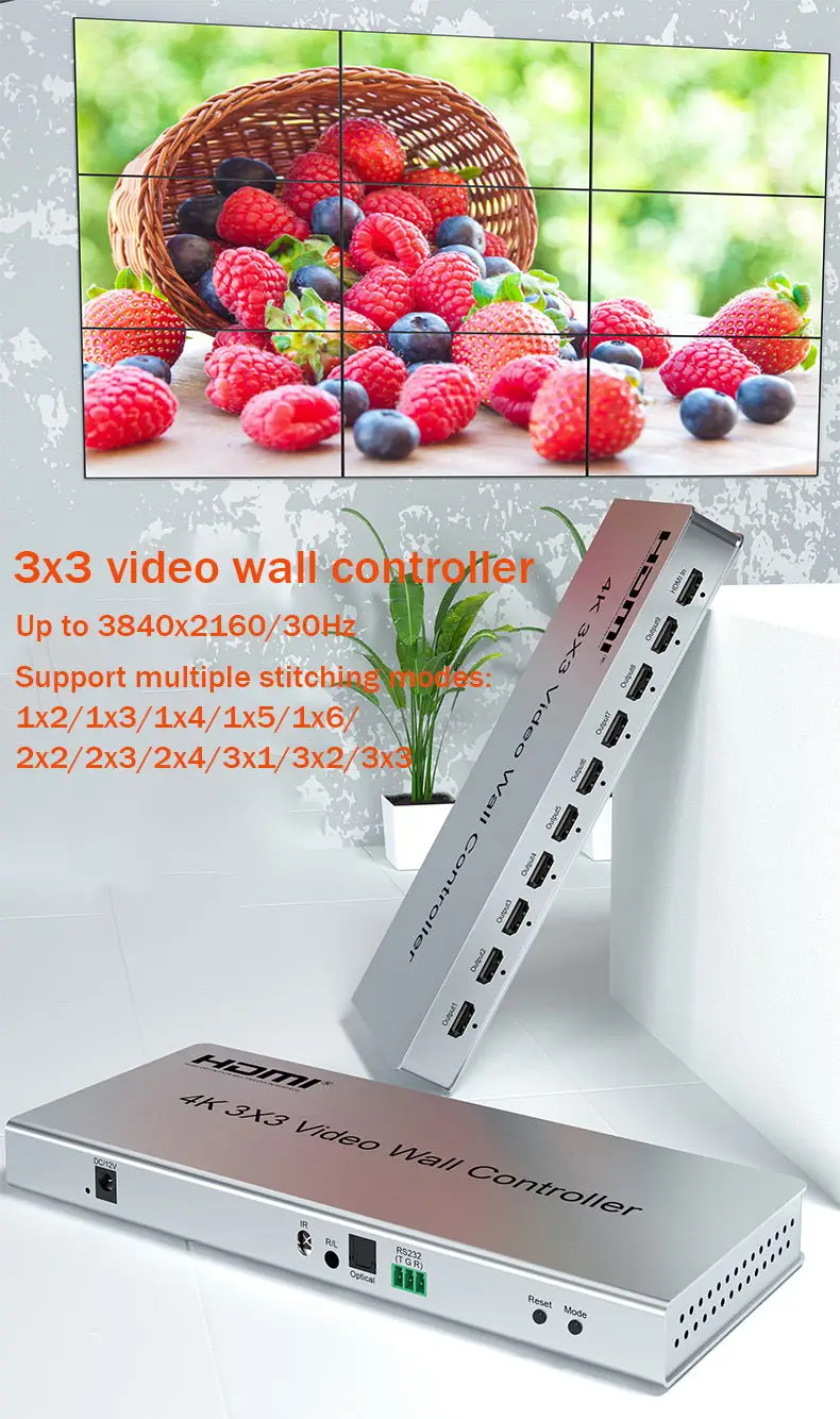 El controlador de pared de video 3x3, admite entrada HDMI de 1 vía y salidas HDMI de 9 vías, la función principal es dividir un completo