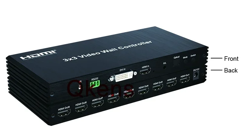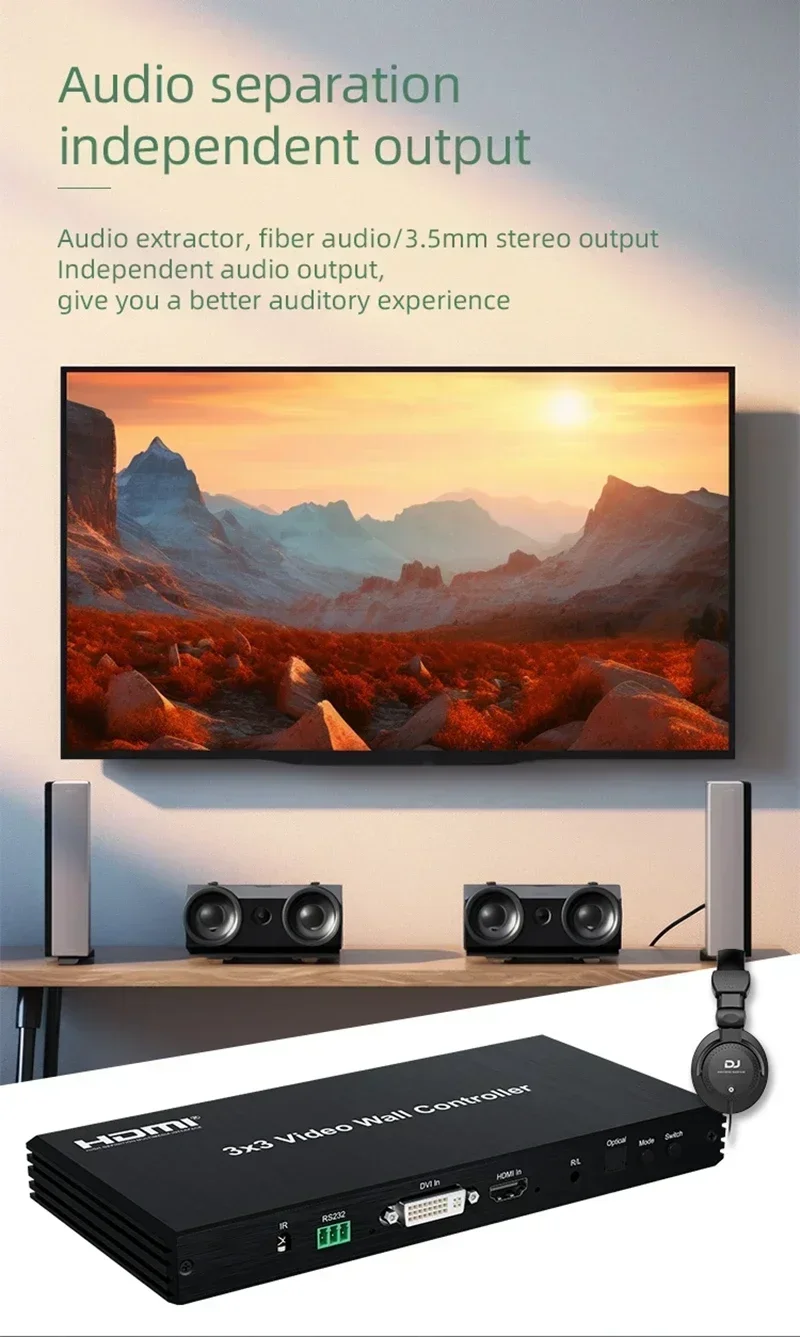 Este controlador de pared de video 3x3, admite 1 entrada HDMI/DVI y 9 salidas HDMI, la función principal es dividir