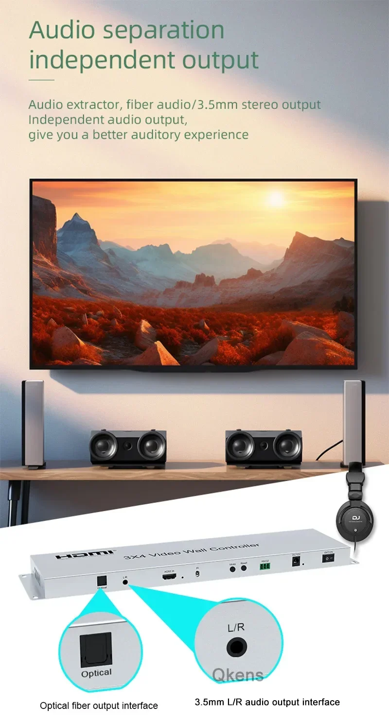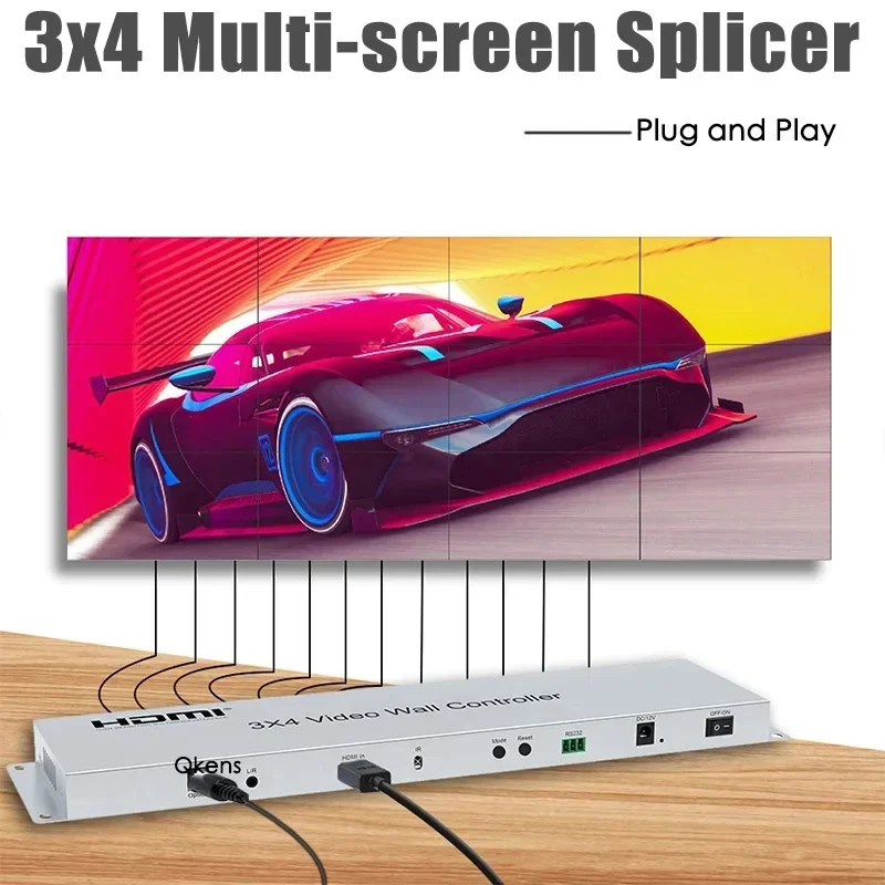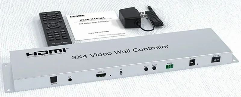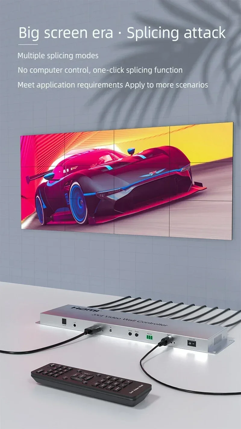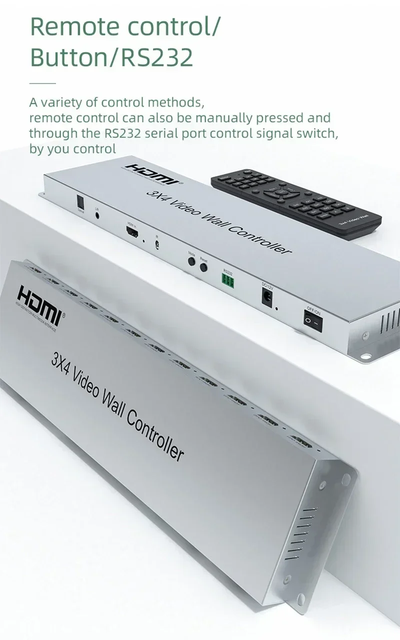 Este controlador de video wall 3X4, admite 1 entrada HDMI y 12 salidas HDMI, la función principal es dividir un señal de imagen HDMI HD completa única en 12 unidades de visualización (pantallas de retroproyección, TV LCD, etc.) para que formen una gran pantalla de imagen dinámica.