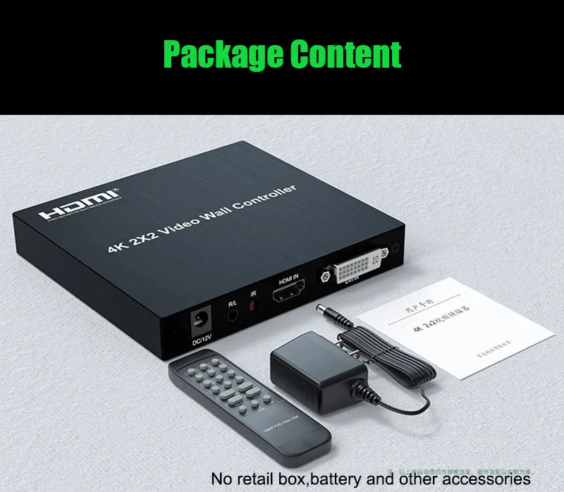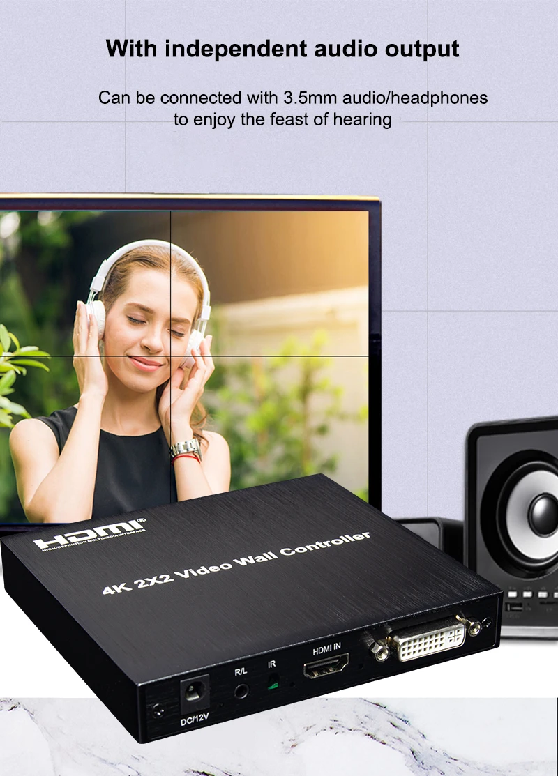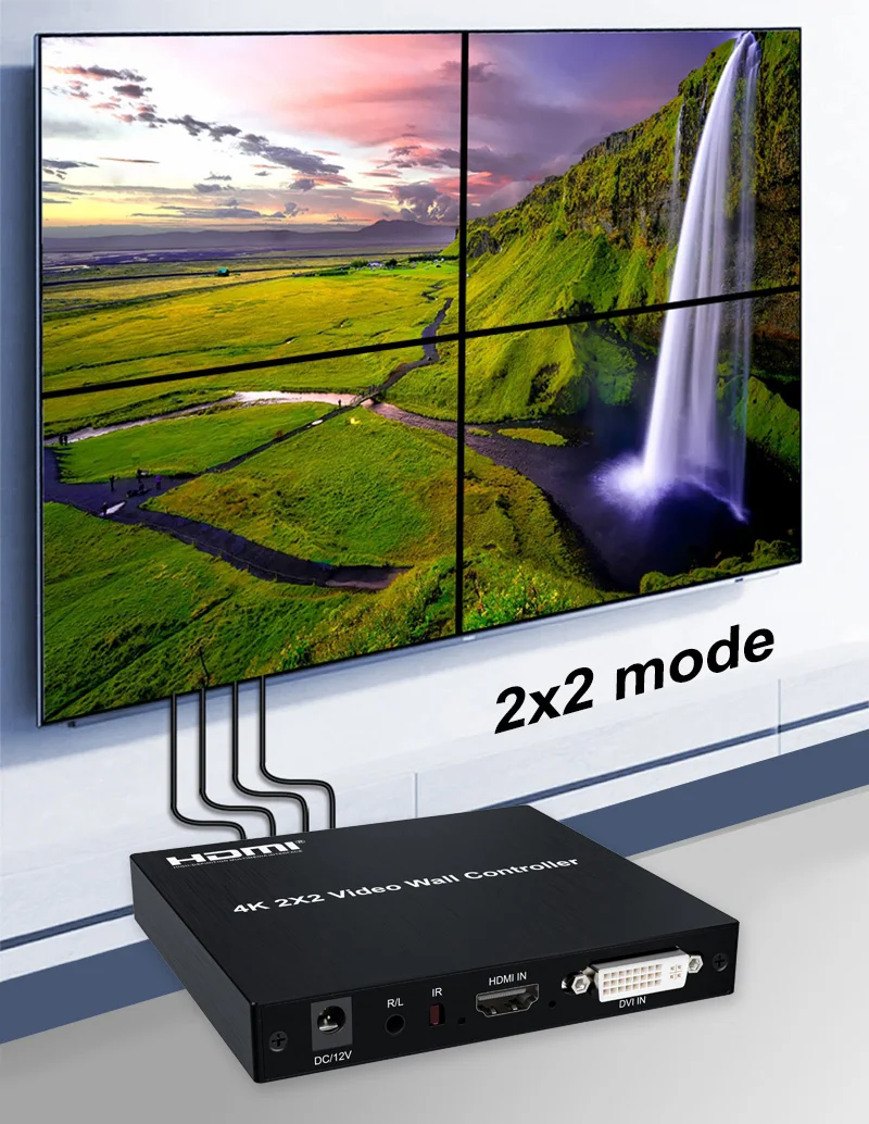Este controlador de pared de video 4K 2x2, admite entrada HDMI o DVI y 4 salidas HDMI, la función principal es dividir un