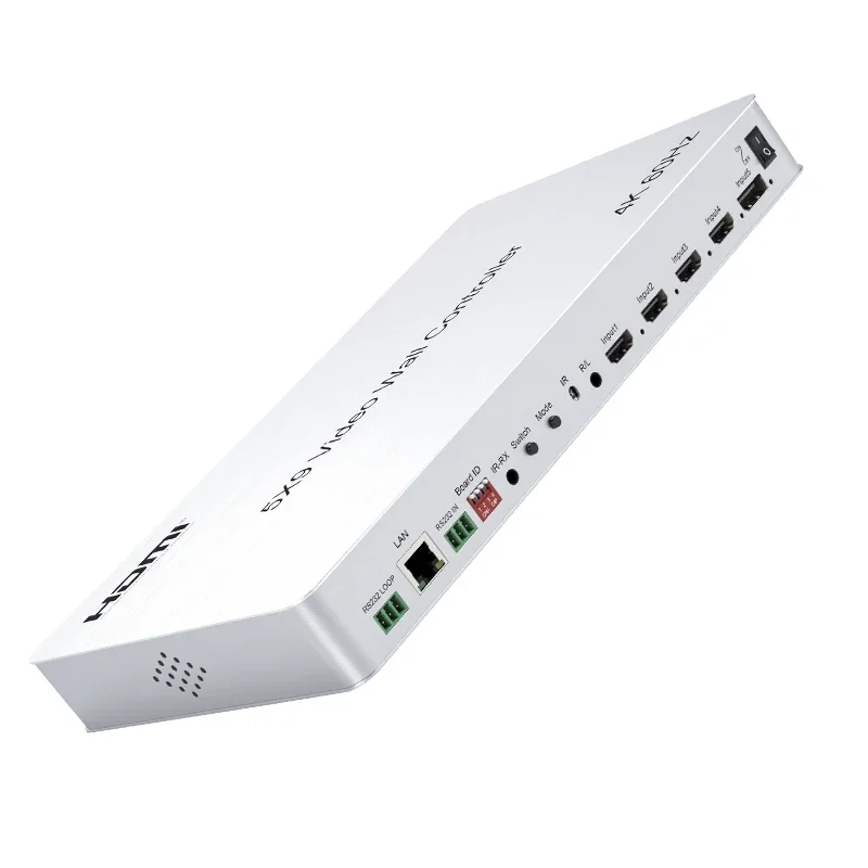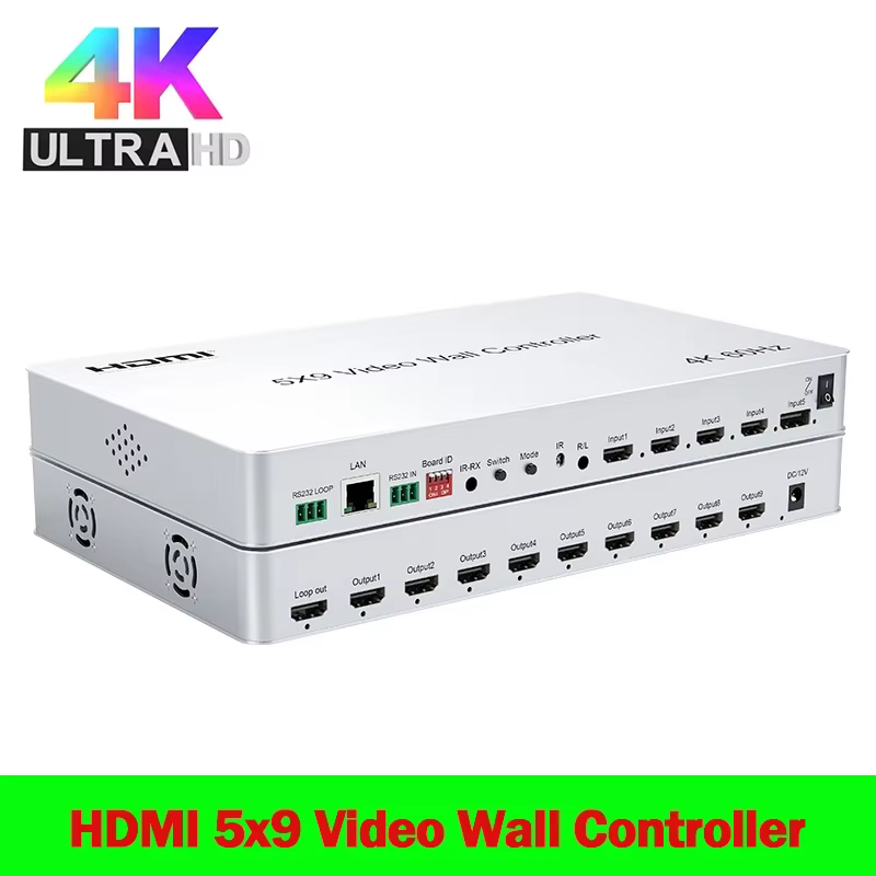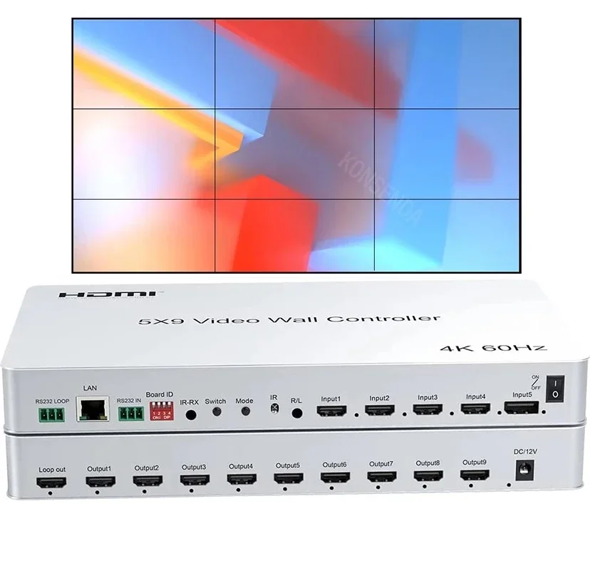 Este controlador de pared de video 5x9 admite entrada HDMI de 4 vías y entrada DP de 1 vía, salida HDMI de 10 vías, (empalme de 9 vías