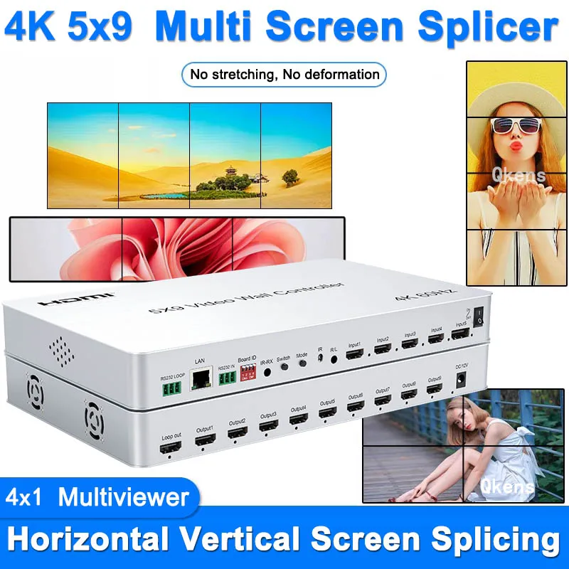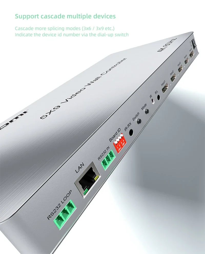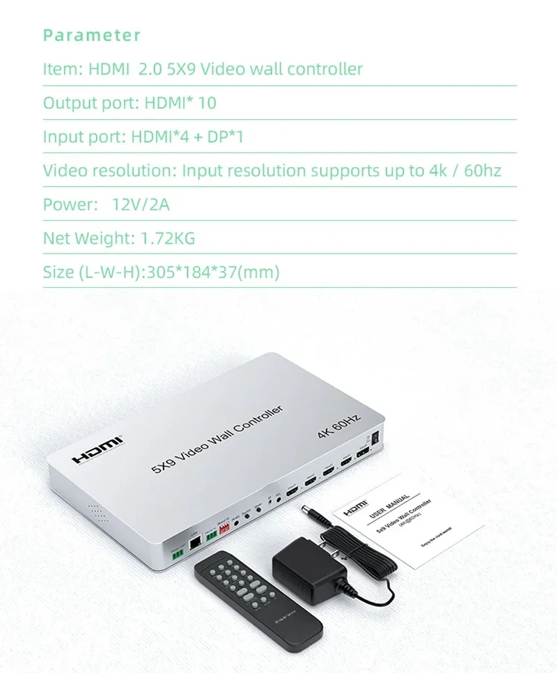 Este controlador de video wall 5x9 admite entrada HDMI de 4 vías y entrada DP de 1 vía, salida HDMI de 10 vías (empalmes de 9 vías)