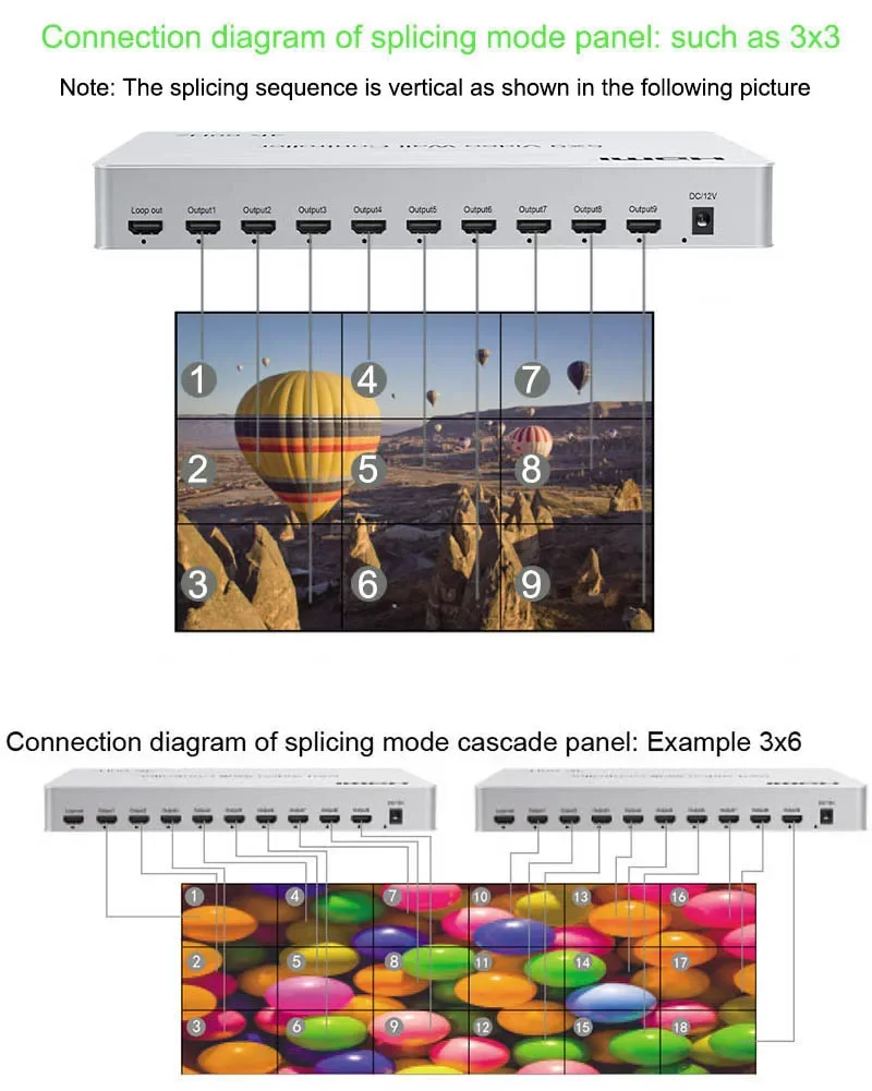 y salida HDMI de 9 vías (1080p@60hz), bypass HDMI de 1 vía (la imagen es consistente con la imagen de empalme),