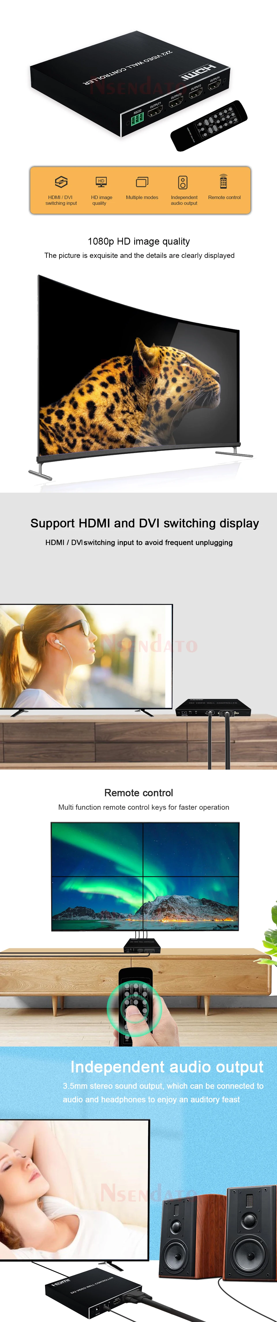 This Nsendato 1080P 2X2 video wall controller,support HDMI or DVI input and 4 HDMI output,Nsendato main function is to divide a complete HDMI,DVI HD image signal into 4 blocks and assign to 4 video display units (such as rear projection unit, LCD TV, etc.). Complete with 4 HDMI HD video display units to form a large dynamic image wall.