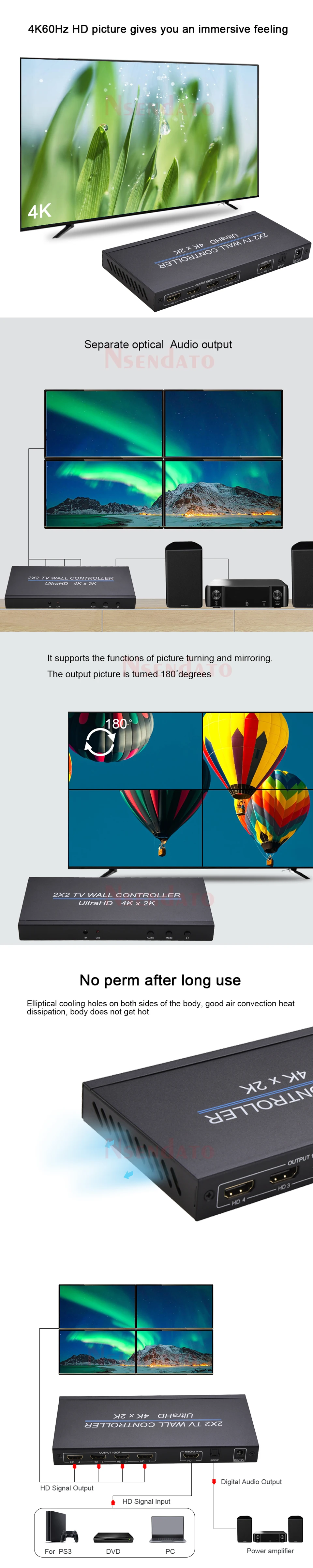 ,The 2x2 tv wall Video controller , support 1-way HD input and 4 HD output, the main function is to divide a complete HD,HD image signal into 4 blocks and assign to 4 video display unit (such as Rear projection unit, LCD TV, etc.), Complete with 4 high-definition video display units to form a large dynamic image screen.