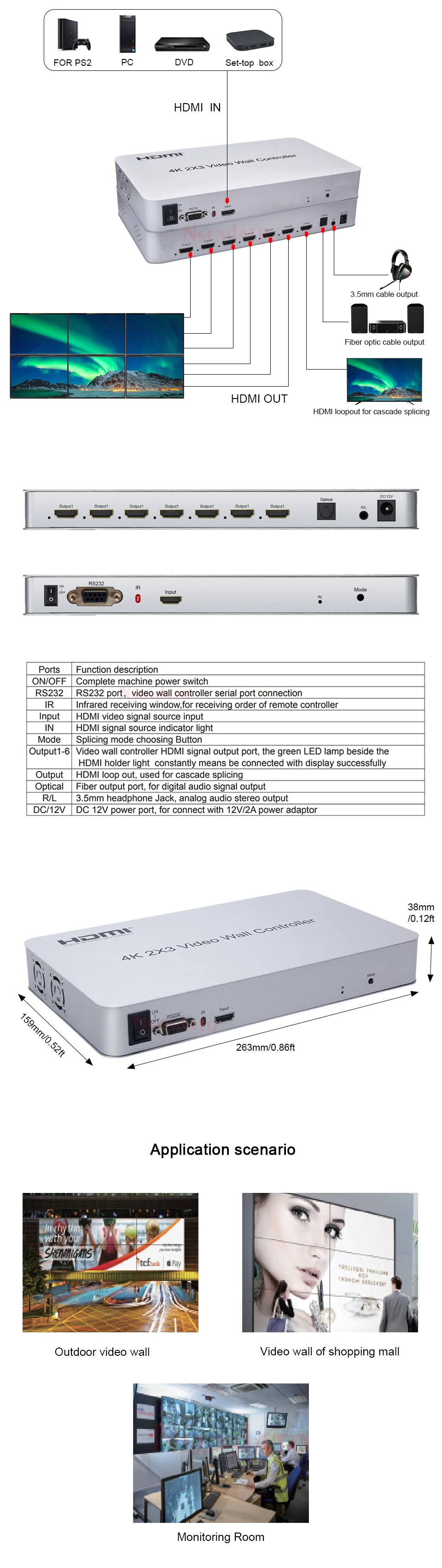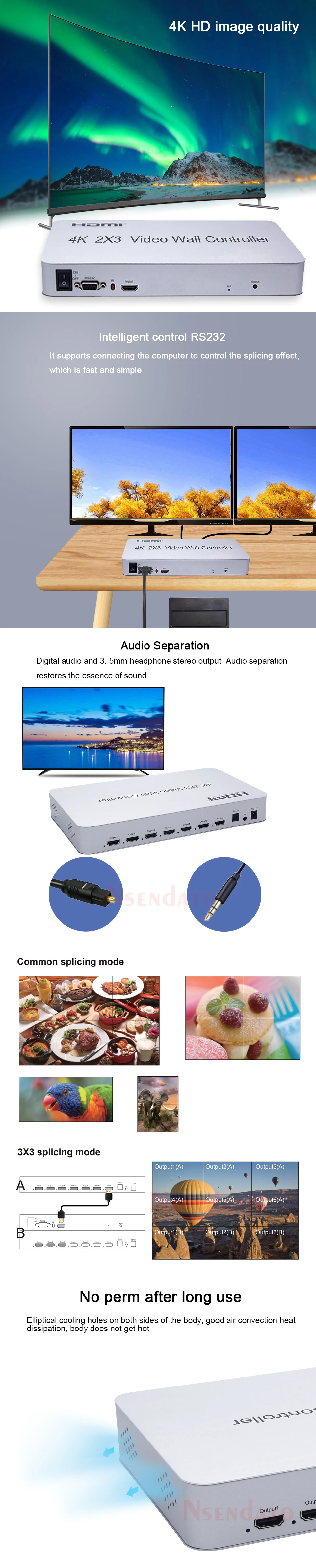 El controlador de pared de video NSENDATO 2x3, admite entrada HDMI de 1 vía y salidas HDMI de 6 vías, la función principal es dividir una señal de imagen HD completa en 6 bloques y asignarla a 6 unidades de visualización de video (como unidad de proyección trasera, TV LCD, etc.), Completo con 6 unidades de visualización de video de alta definición HDMI para formar una gran imagen dinámica e screen.com posar una pared de video perfectamente sin ningún software de control, plug and play, fácil de operar. Ampliamente utilizado en ocasión de la pantalla de publicidad, restaurante, enseñanza, etc.