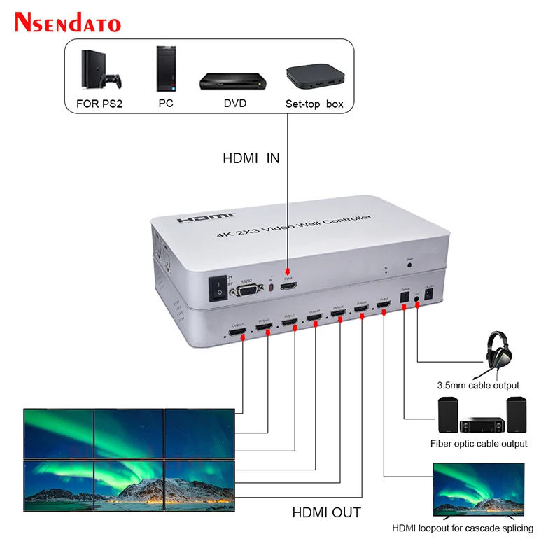 El controlador de pared de video NSENDATO 2x3, admite entrada HDMI de 1 vía y salidas HDMI de 6 vías, la función principal es dividir una señal de imagen HD completa en 6 bloques y asignarla a 6 unidades de visualización de video (como unidad de proyección trasera, TV LCD, etc.), Completo con 6 unidades de visualización de video de alta definición HDMI para formar una gran imagen dinámica e screen.com posar una pared de video perfectamente sin ningún software de control, plug and play, fácil de operar. Ampliamente utilizado en ocasión de la pantalla de publicidad, restaurante, enseñanza, etc.