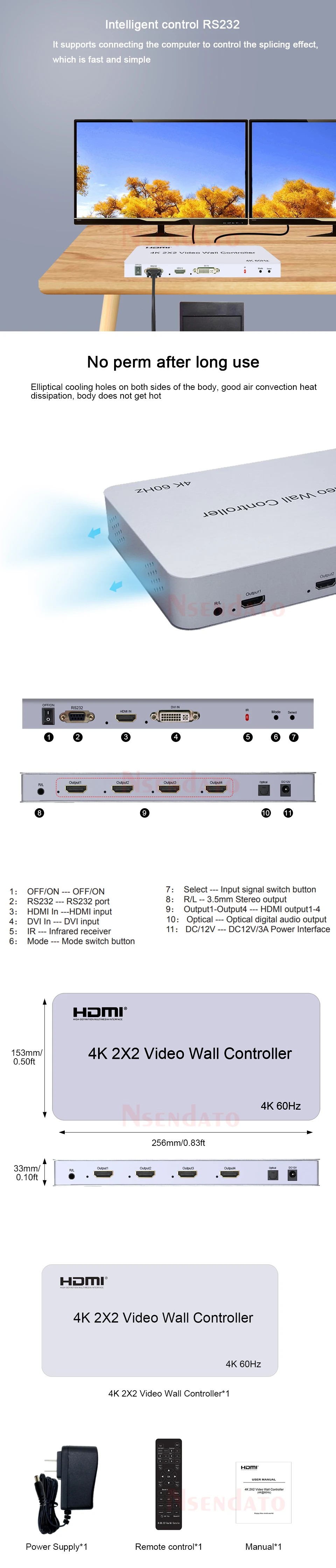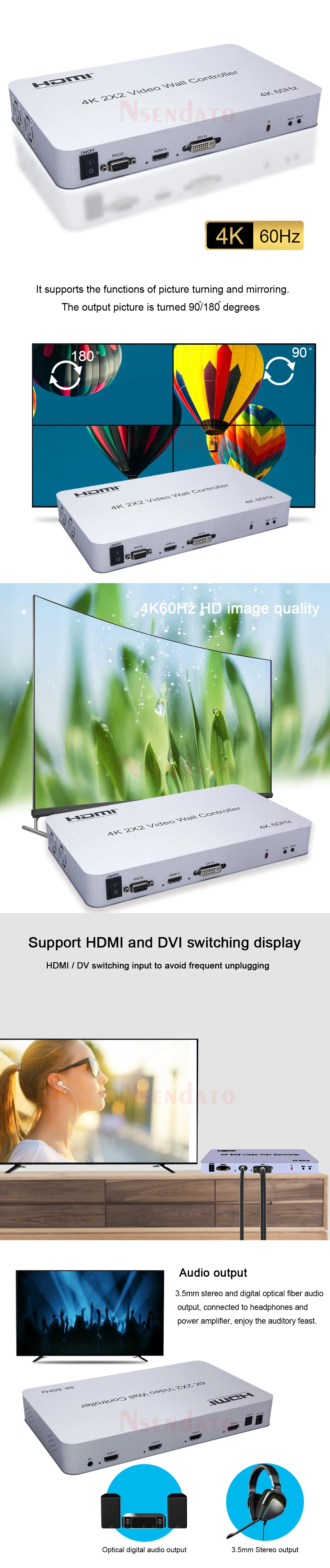 El controlador de pared de video 4K 2x2, admite entrada HDMI o DVI de 1 vía y salida 4 HDMI, la función principal es dividir una señal de imagen HDMI/DVI HD completa en 4 bloques y asignarla a 4 unidades de visualización de video (como unidad de proyección trasera, TV LCD, etc.), Completo con 4 unidades de visualización de vídeo de alta definición HDMI para formar una gran pantalla de imagen dinámica.