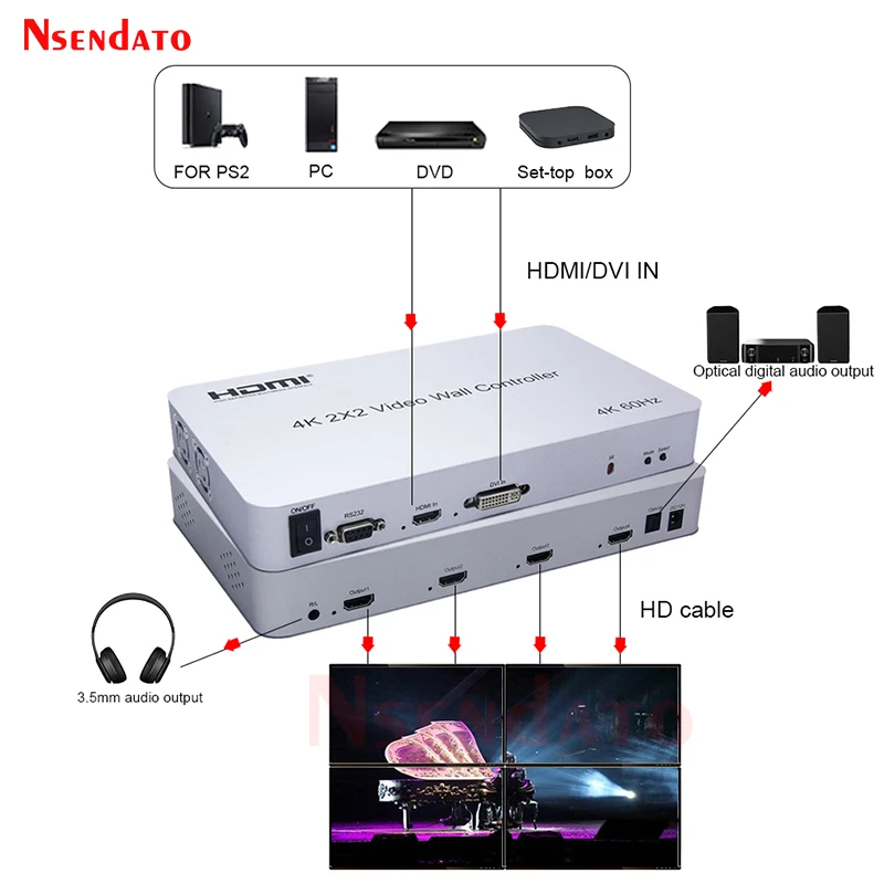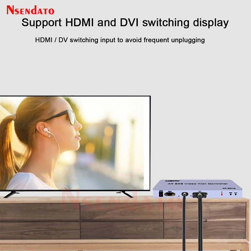 El controlador de pared de video 4K 2x2, admite entrada HDMI o DVI de 1 vía y salida 4 HDMI, la función principal es dividir una señal de imagen HDMI/DVI HD completa en 4 bloques y asignarla a 4 unidades de visualización de video (como unidad de proyección trasera, TV LCD, etc.), Completo con 4 unidades de visualización de vídeo de alta definición HDMI para formar una gran pantalla de imagen dinámica.