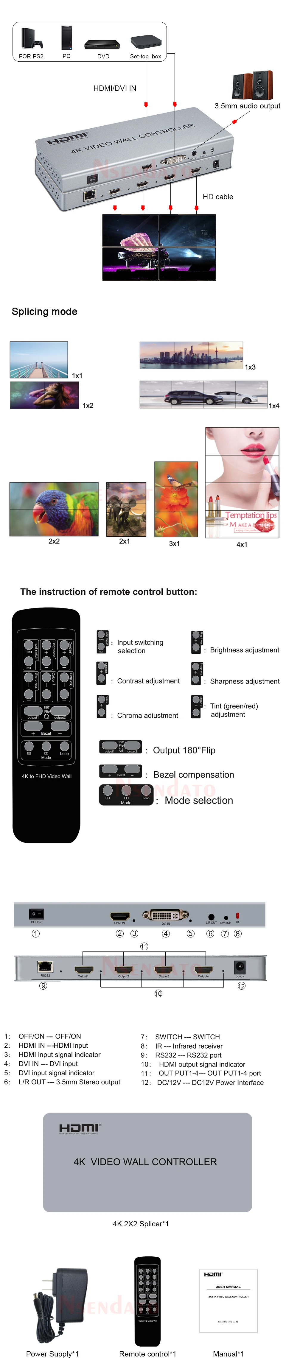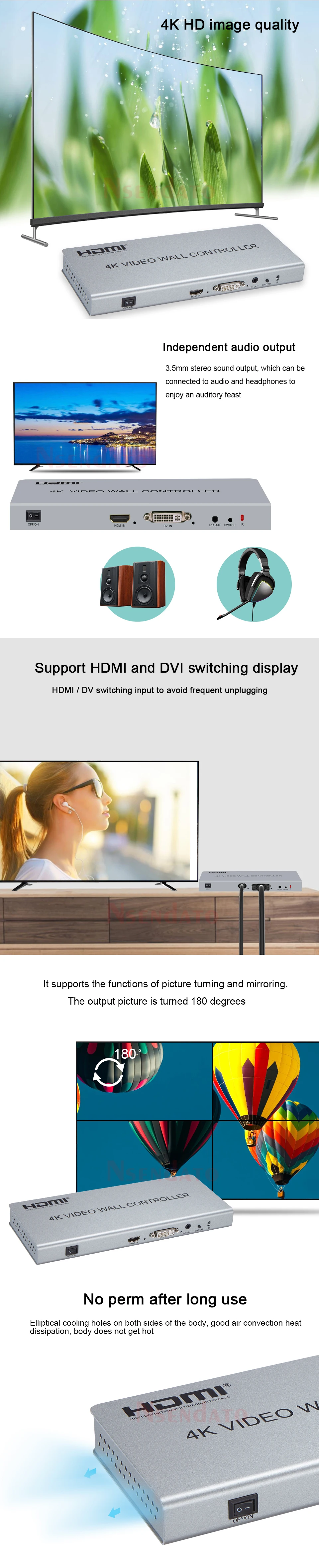 El Control de pared de vídeo Nsendato 2x2 admite entrada HDMI o DVI de 1 vía y 4 salidas HDMI, la función principal es dividir un HDMI completo, señal de imagen DVI HD en 4 bloques y asignar a 4 unidades de visualización de video (como unidad de proyección trasera, TV LCD, etc.), completo con 4 unidades de visualización de video de alta definición HDMI para formar una gran pantalla de imagen dinámica