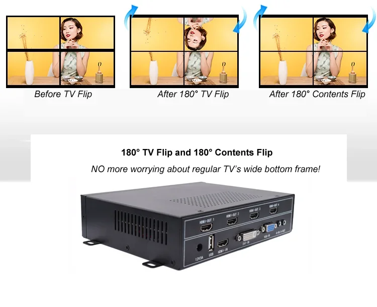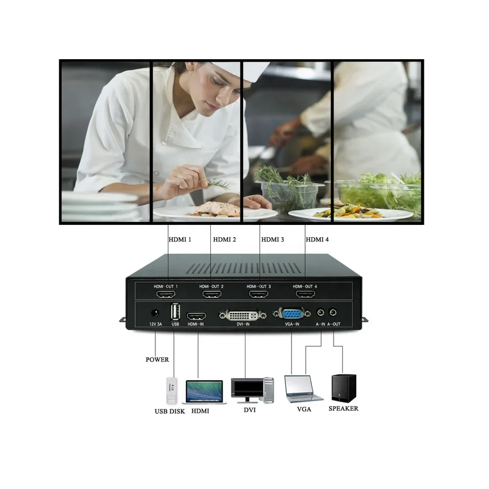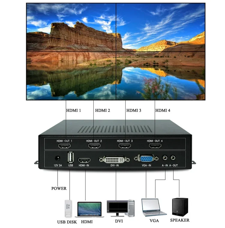 Descripción general del producto:Este controlador de pared de video es para TV LCD, pantalla LCD lateral ultra estrecha, proyector, etc. El procesador de mosaico de imágenes de alta definición se puede personalizar de acuerdo con las necesidades del usuario empalme de salida de 2 a 4 H-2. Productos con chip de procesamiento de alta definición, admite entrada y salida de señal 1080P, admite 1 Vídeo Compuesto, 1 VGA, 1 modelo USB, 1 entrada H-2, 1 entrada DVI, todas las señales de entrada se pueden cambiar a la pantalla grande y la salida de sincronización de audio y vídeo.