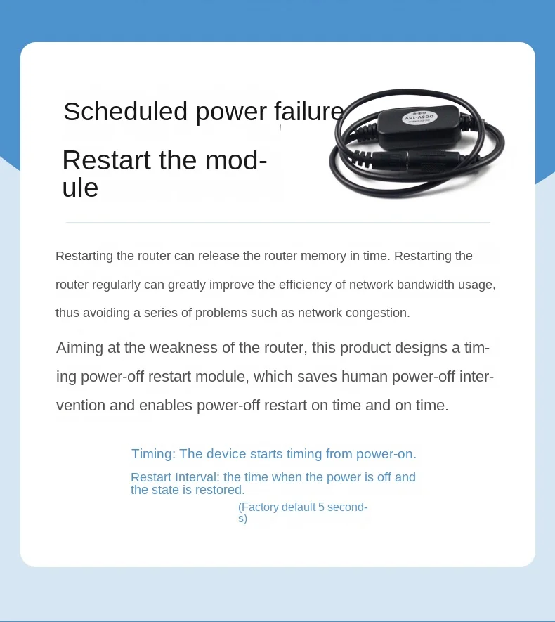 Apuntando a los puntos débiles del enrutador, este producto diseña una línea de apagado y reinicio de tiempo, que ahorra la intervención del apagado y logra el apagado y reinicio de punto fijo.