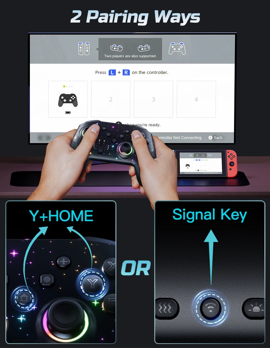 Tiempo de ejecución: 10-15H, Completamente cargado: 3-4H; El controlador del interruptor es compatible con Switch/Lite/OLED/iOS/Android/PC Windows 7/8/10/11.Sin retraso en la entrada, sin señales de caída.El interruptor del controlador profesional es fácil de emparejar rápidamente de 2 maneras: 1Presione la tecla de emparejamiento en la parte posterior 2Presione los botones Y e INICIO durante 3 segundos.Para evitar que la batería se agote, entra en modo de suspensión si no se usa después de 20 minutos.Simplemente toque el botón INICIO para despertarlo