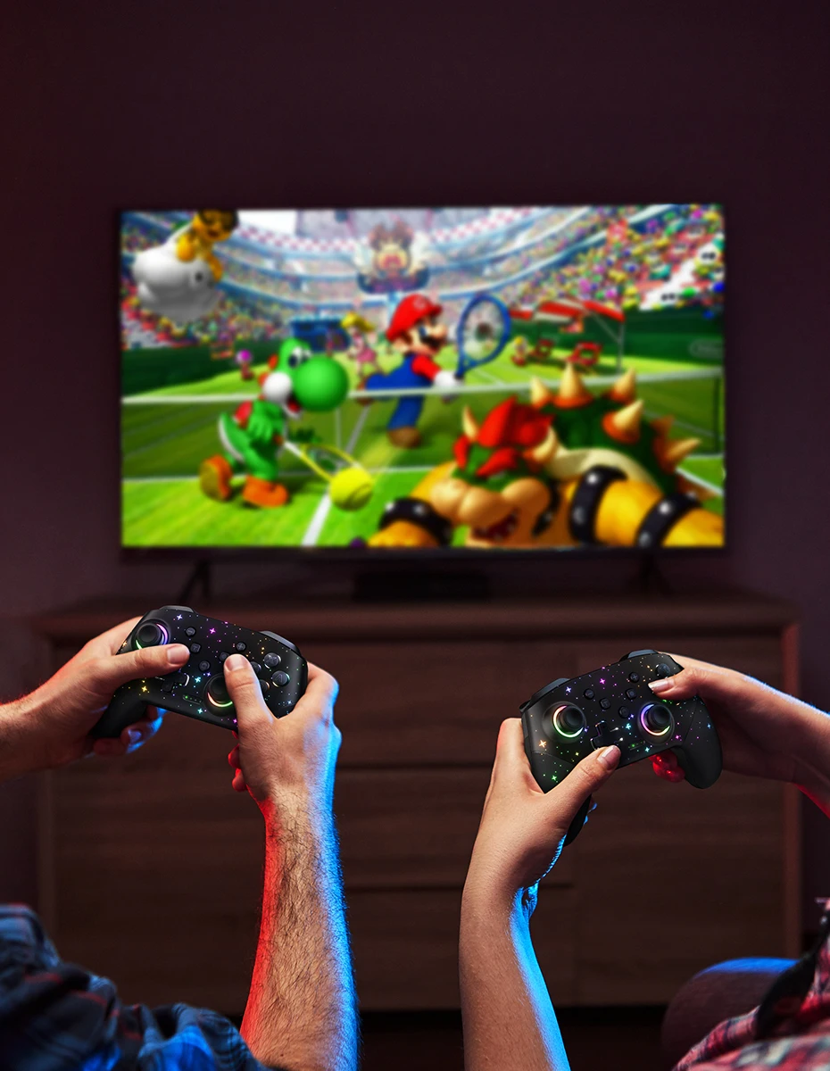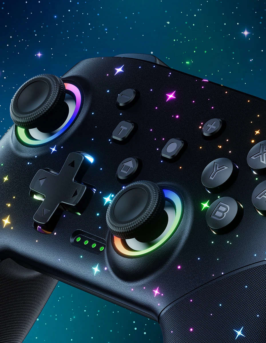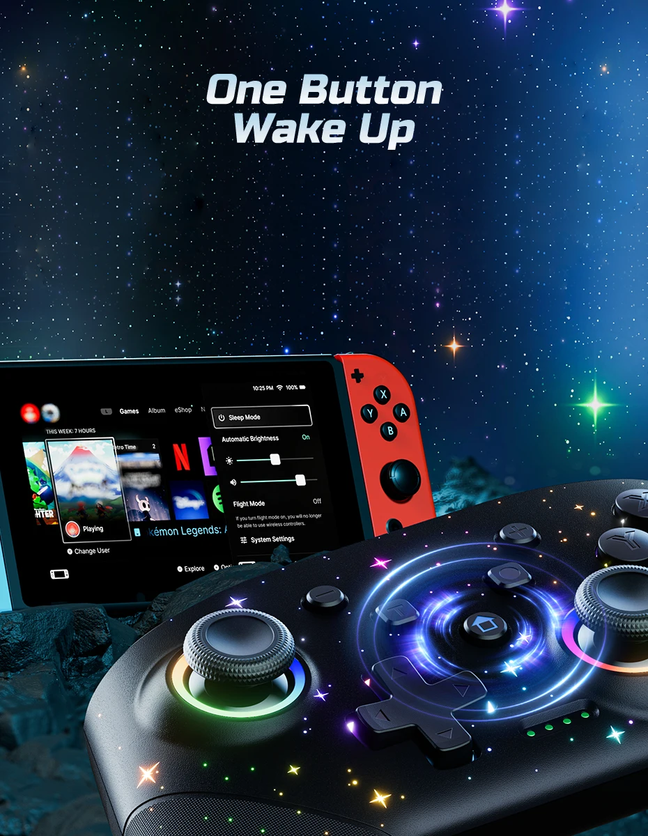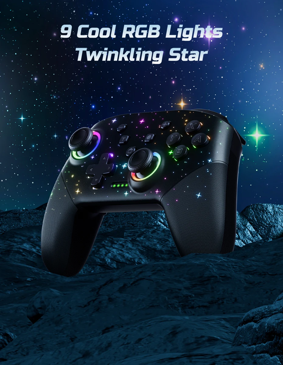 Puede controlar el modo de luz de los controladores del interruptor: estrellas parpadeantes, estrellas de un solo color que brillan, estrellas de respiración lenta, luz estroboscópica y LED apagados.Las estrellas se lanzan y se ven geniales en una habitación con poca luz mientras juegas.El controlador switch pro está bien hecho, es resistente y tiene un bonito acabado mate con un excelente agarre.Ligero y cabe cómodamente en sus manos para largos tiempos de juego (sin NFC, no para Amiibos)