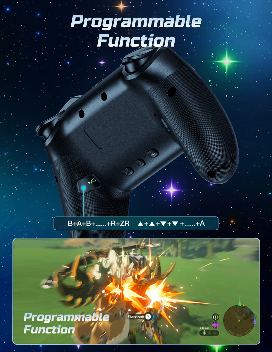 Puedes mapearlo solo en uno de los botones o crear una combinación de botones si lo deseas.(M1/M2=cualquier tecla A/B/X/Y/L/ZL/R/ZR/L3/R3/D-pad, hasta 16 teclas).2 modos de programación: 1mapeo único 2 mapeo múltiple.Admite el modo Auto Turbo/Manual Turbo.3 velocidades de ráfaga ajustables: 5 disparos/s, 12 disparos/s y 20 disparos/s.El botón programable y Turbo maximizará el juego.