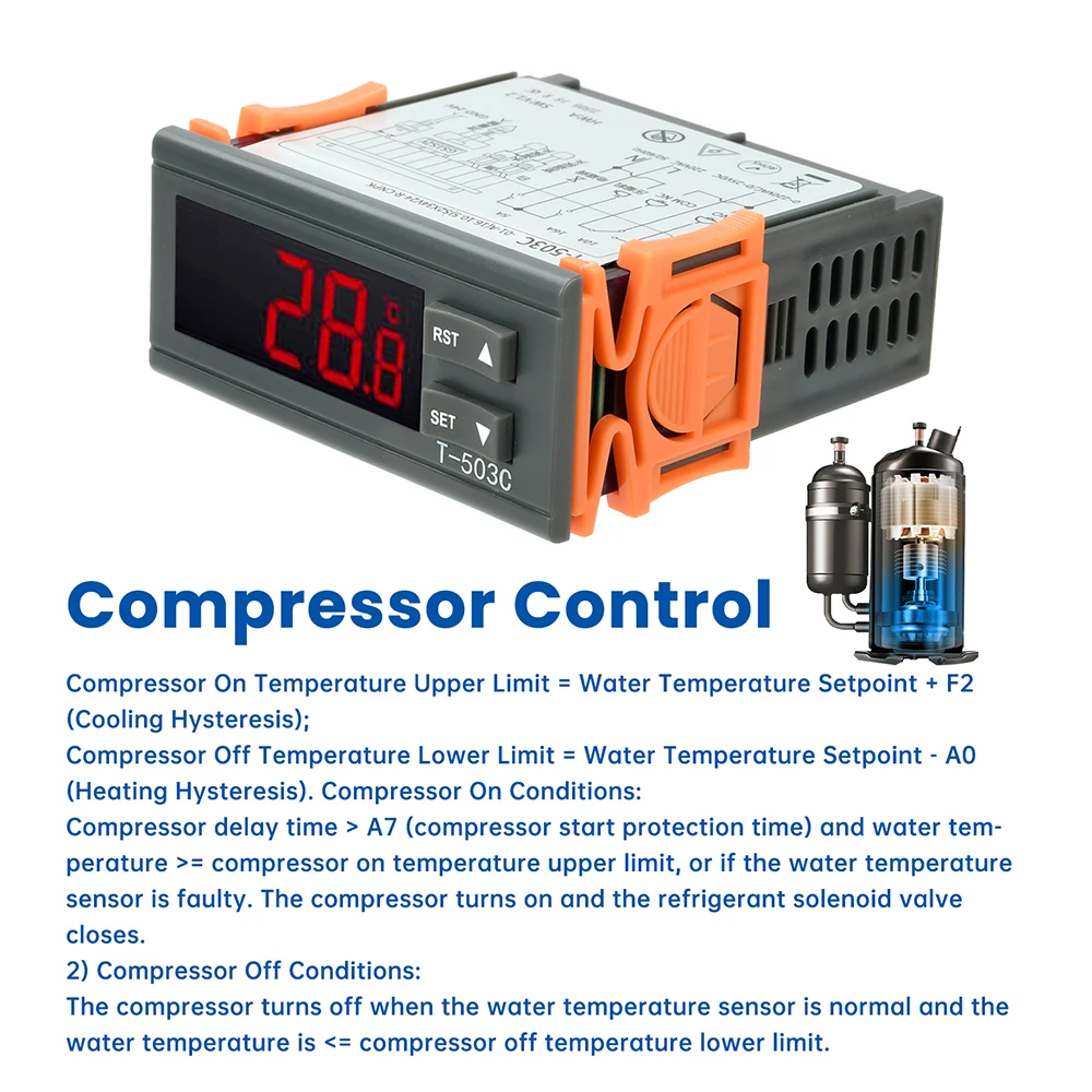 1. Laser Chiller Temperature Controller: Starts/stops the refrigeration compressor and controls the refrigerant solenoid valve to achieve precise water temperature regulation, featuring a simultaneous room temperature adjustment mode.2. Dual temperature sensors for water temperature regulation and room temperature monitoring, with a measurement range of -40 to 99.9°C and a display resolution of 0.1°C.3. Dual-temperature control mode: Automatically adjusts water temperature setpoints based on ambient temperature changes for precise water temperature control, offering convenience and practicality.4. Multi-channel control outputs: 24V power supply with compressor output, solenoid valve output, and fault alarm output. Diverse functionality for broad applicability.5. Wide range of applications: Suitable for laser chillers, oil coolers, high-power chillers, industrial air conditioners, and related fields.