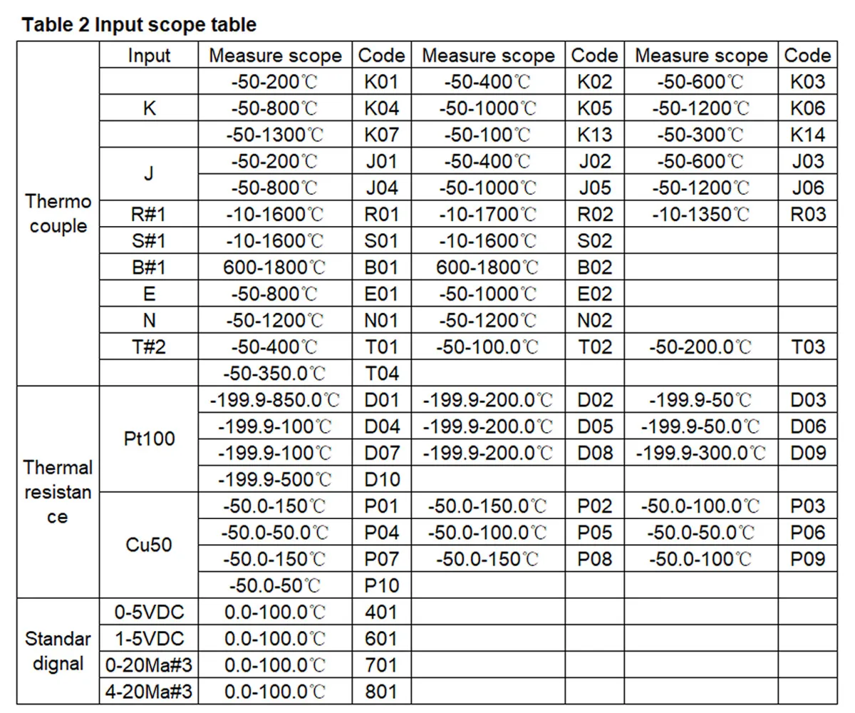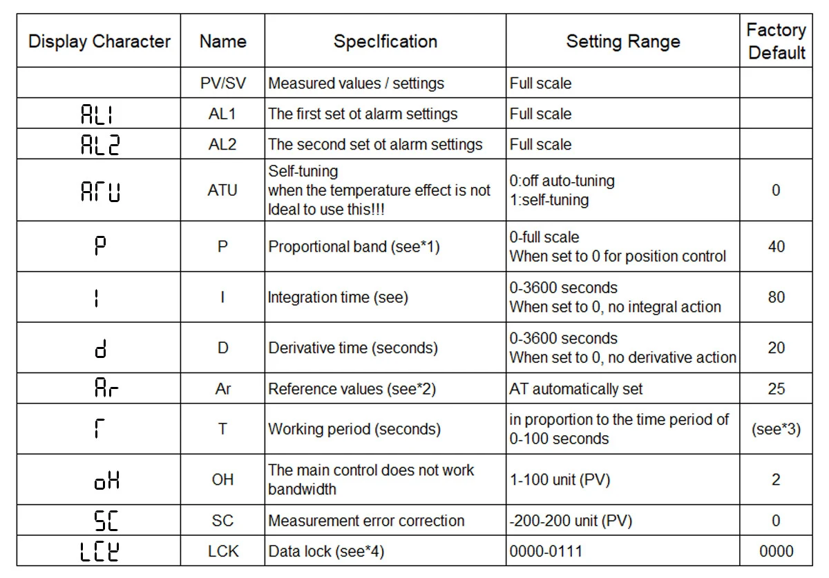 * 1: Cuando ≠ 0, PID instrumentación para control, la necesidad de racionalizar los valores establecidos del "LD" el primero en abrir la función de autoajuste "AT", para establecer el control para lograr el mejor cuando P=0, control ON / OFF, debe configurarse para controlar el valor de la diferencia de retorno "OH"