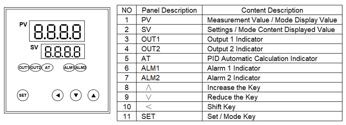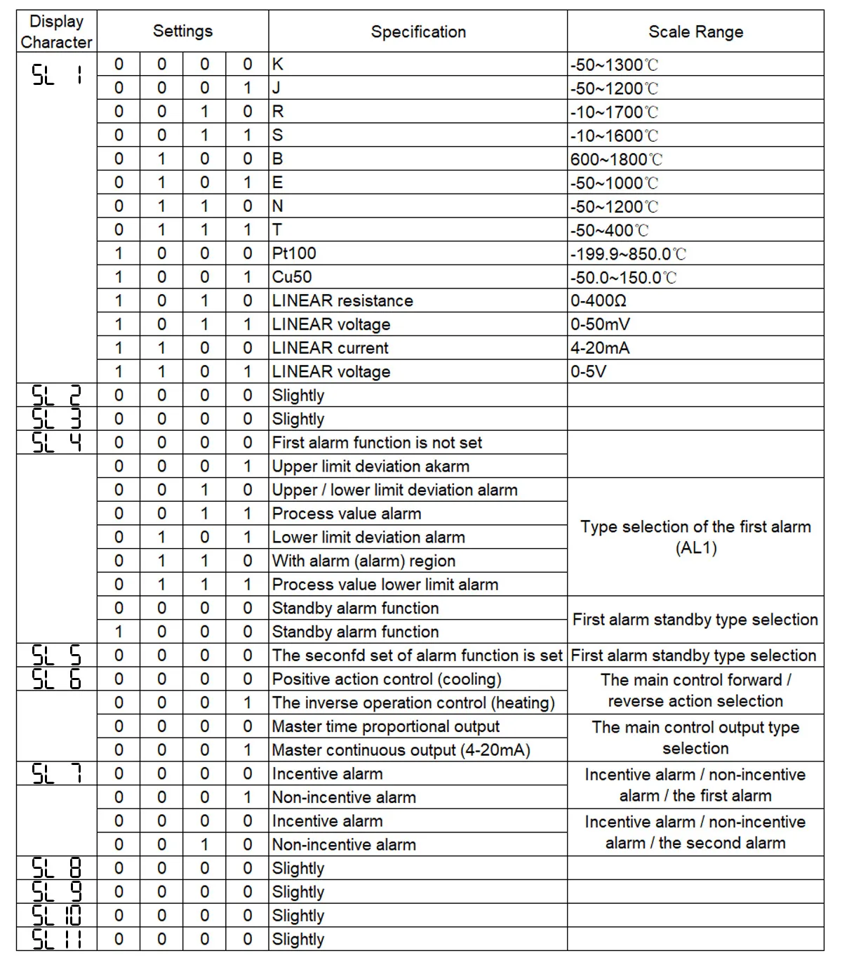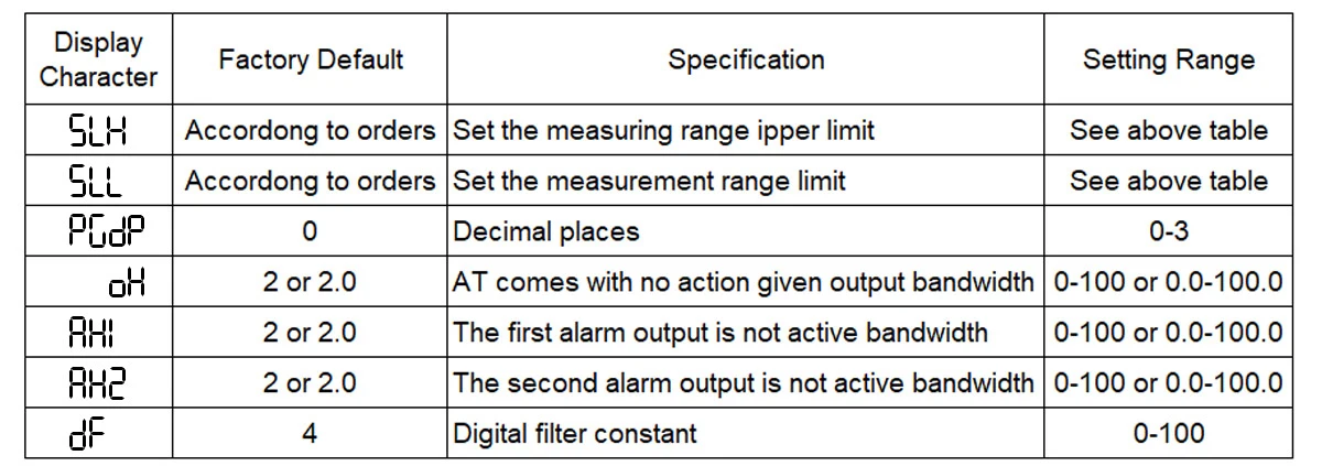 Este parámetro se utiliza para configurar la alarma, las constantes PID y otros parámetros. Modo de visualización normal, mantenga presionado el botón "SET" durante tres segundos, la pantalla PV muestra el modo de configuración de parámetros, muestre los valores correspondientes en los parámetros de visualización "SV" en la siguiente tabla, presione el botón "SET" para mostrar los símbolos: