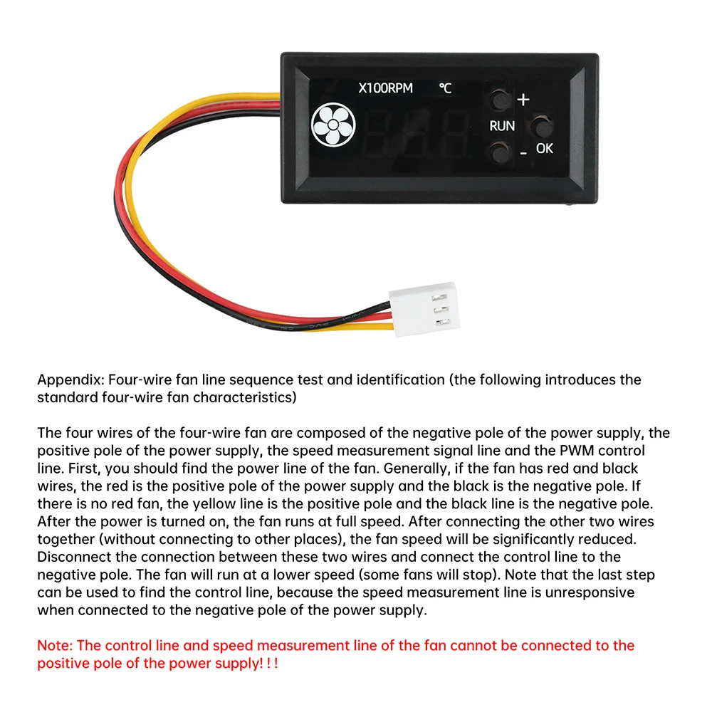 Controlador de velocidad de control de temperatura del ventilador de cuatro cables DC12V, pantalla digital de temperatura y velocidad, soporte para 3A o menos apagado de baja temperatura del ventilador (apague directamente la alimentación del ventilador), soporte para ventilador crónológico inverso compatible con pantalla de velocidad del ventilador de 10,000 RPM (teórica soporte para hasta 300X100RPM es decir, 30.000RPM)