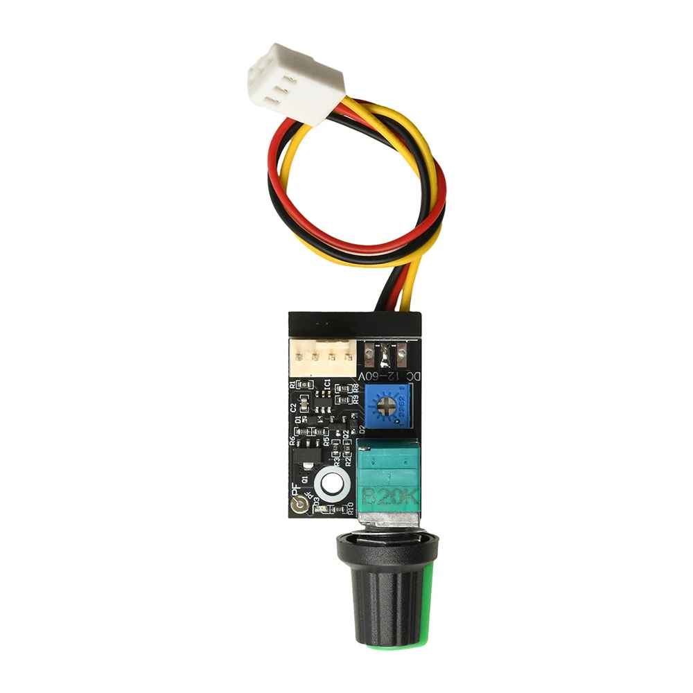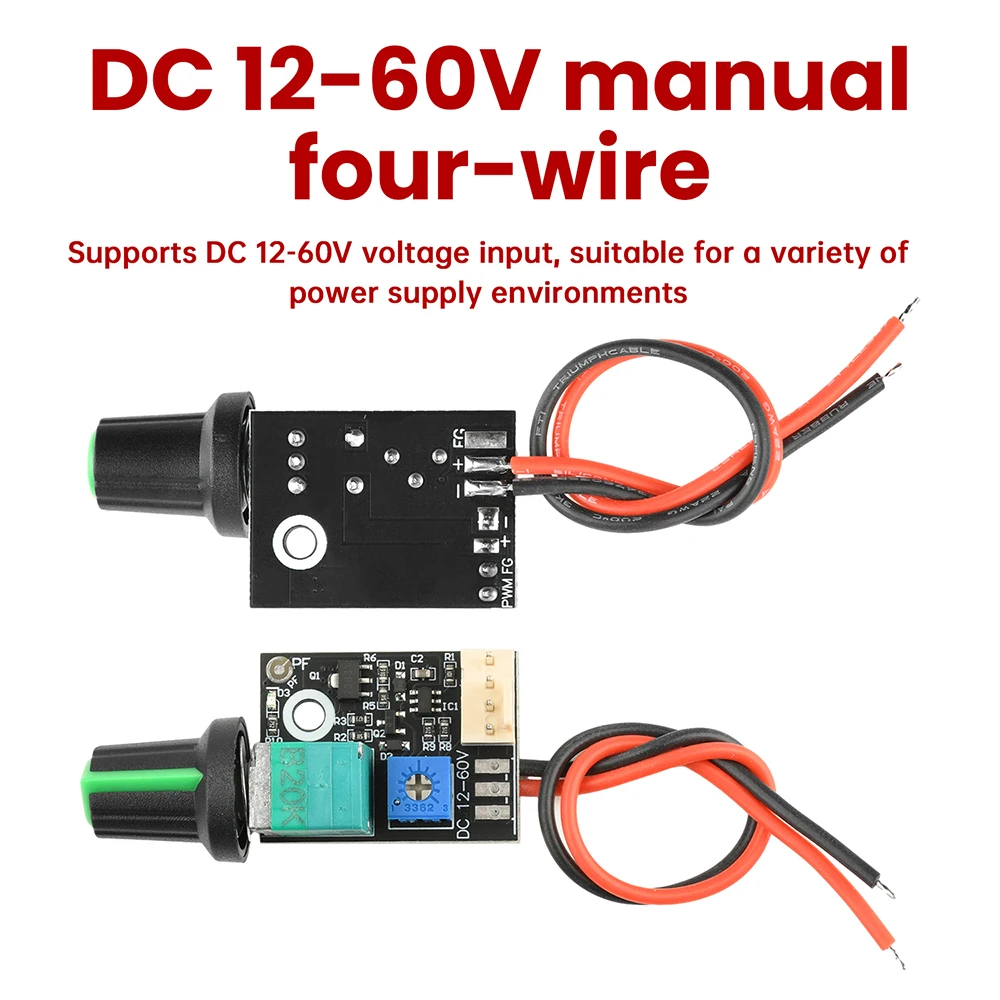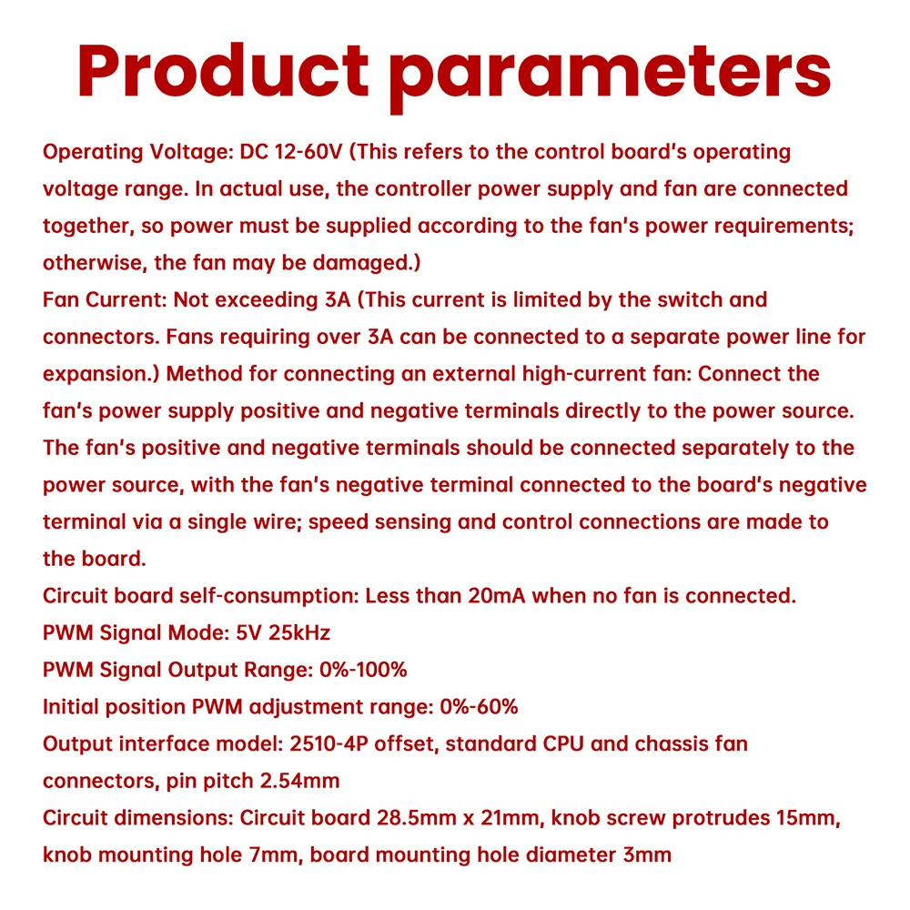 Voltaje de funcionamiento: CC 12-60 V (Nota: esto se refiere al rango de voltaje de funcionamiento del tablero de control.En el uso real, la fuente de alimentación del controlador y el ventilador están conectados entre sí, por lo que se debe suministrar energía de acuerdo con los requisitos de energía del ventilador; de lo contrario, el ventilador podría dañarse)