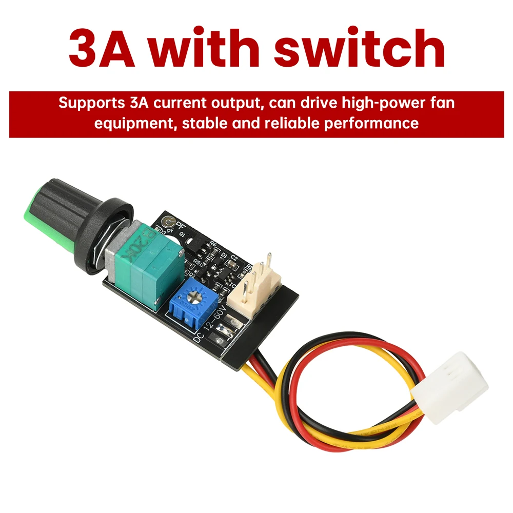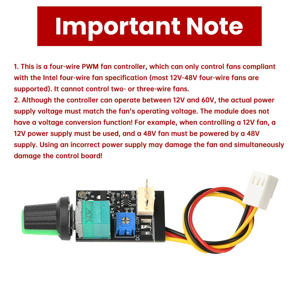 2.Aunque el controlador puede funcionar entre 12 V y 60 V, el voltaje real de la fuente de alimentación debe coincidir con el voltaje de funcionamiento del ventilador.¡El módulo no tiene función de conversión de voltaje!Por ejemplo, al controlar un ventilador de 12 V, se debe utilizar una fuente de alimentación de 12 V y un ventilador de 48 V debe funcionar con una fuente de 48 V.¡La selección incorrecta de la fuente de alimentación puede quemar el ventilador y dañar simultáneamente el tablero de control!