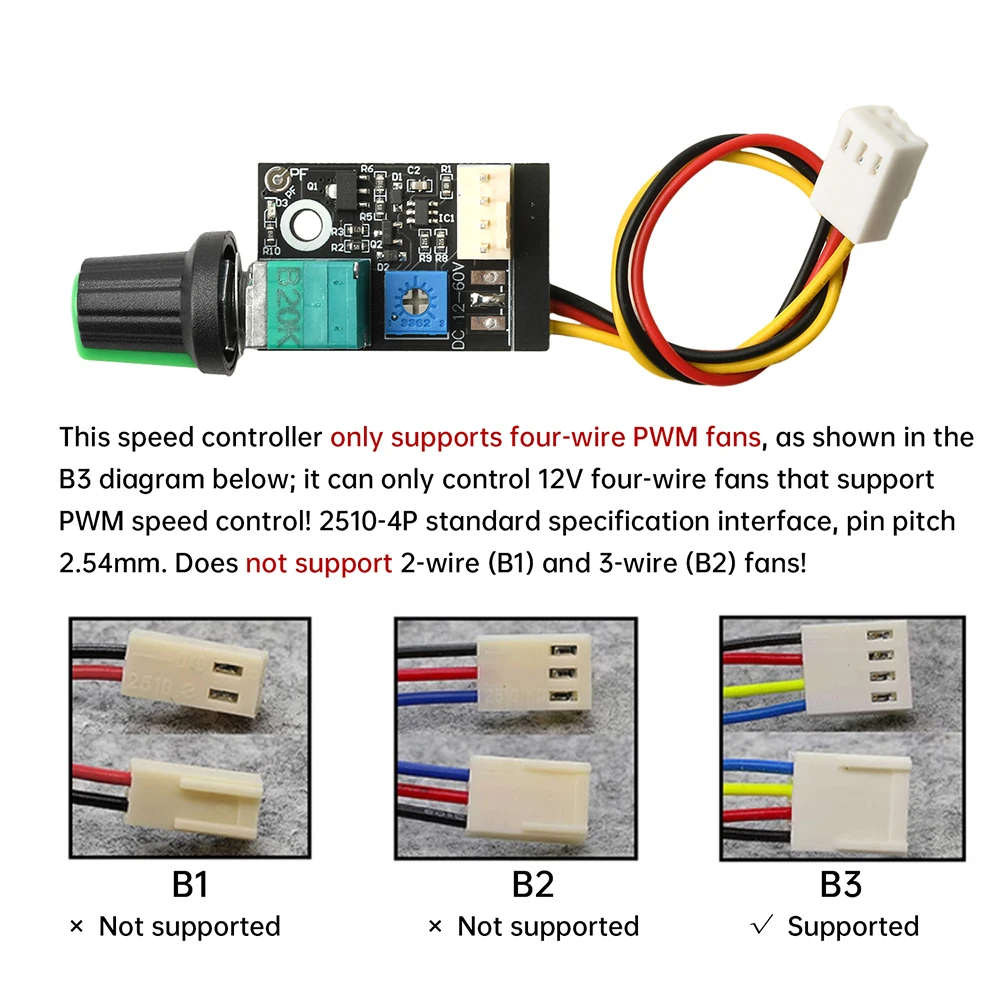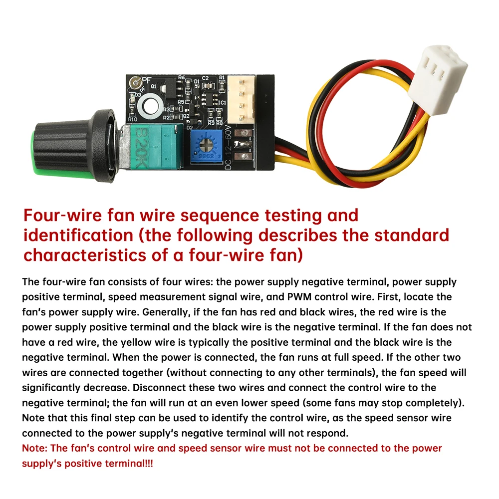 1.Este es un controlador de ventilador PWM de cuatro cables y solo puede controlar ventiladores que cumplen con las especificaciones de ventilador Intel de cuatro cables (se admiten la mayoría de los ventiladores de cuatro cables de 12 V-48 V).No puede controlar 2-3 ventiladores de cable