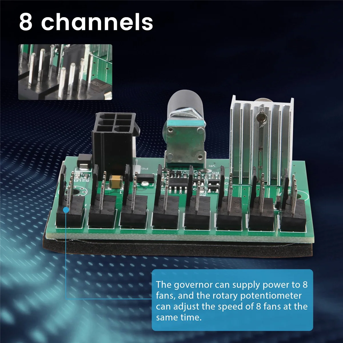 Este regulador puede suministrar energía a 8 ventiladores y girar el potenciómetro puede ajustar la velocidad de 8 ventiladores al mismo tiempo.