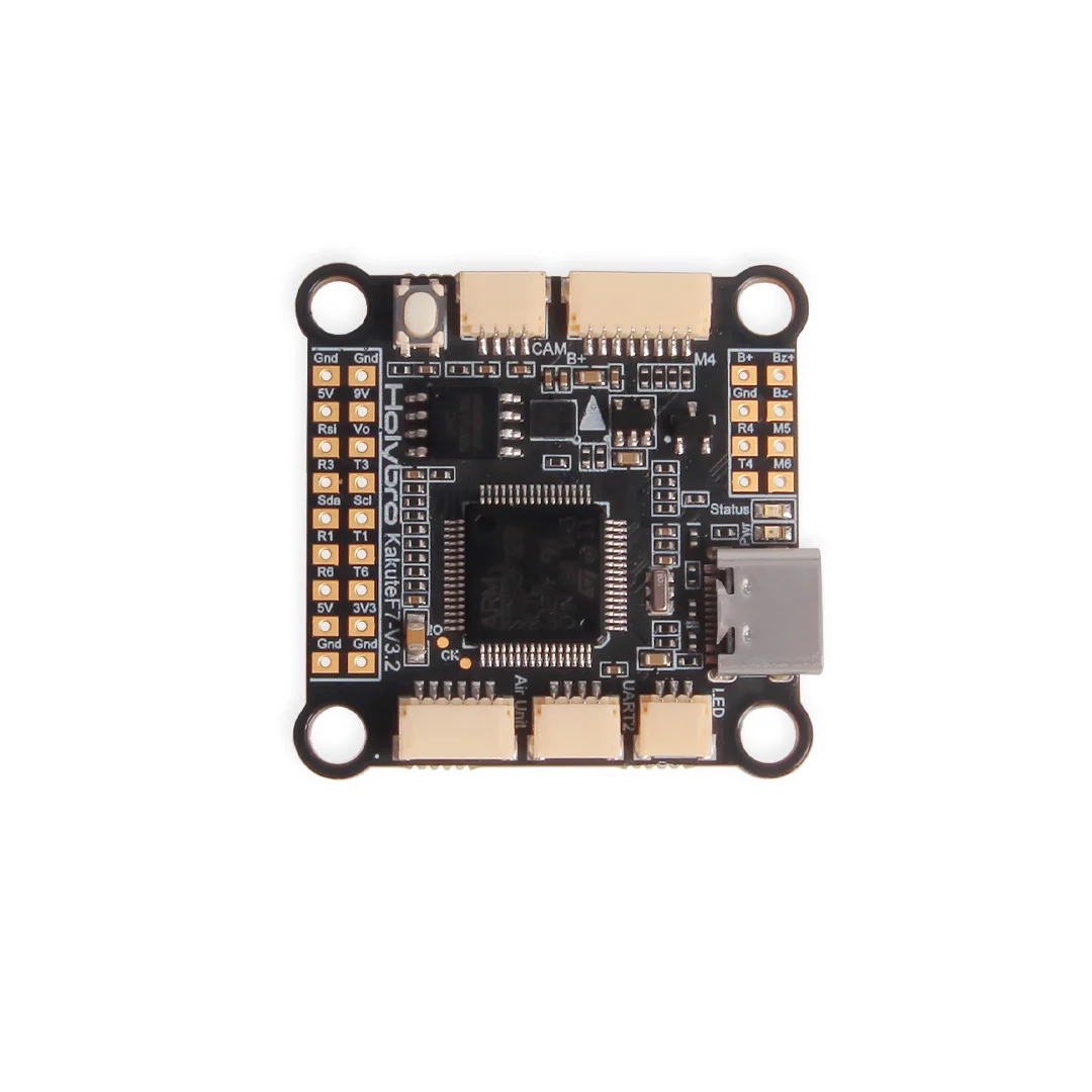Especificaciones: MCU: procesador STM32F72322 de 32 bits, 216 MHz, 256 Kbytes de RAM, 512 Kbytes Flash IMU: ICM42688-P(SPI) Barómetro: BMP280 Visualización de pantalla: AT7456E 5 UART de hardware (UART1, 2, 3, 4, 6) 7x salidas PWM (6 salidas de motor, 1 LED) 16 MB integrados para registro de cajas negras Voltaje de entrada de la batería: 3S-8S BEC: 9 V/3 A, 5 V/2 A, 3,3 V/0,2 A. Conector 2 puertos ajustable eléctricamente JST-SH de 8 pines 1 puerto JST-SH de 6 pines para HD VTX 2x puertos JST-SH de 4 pines para receptores y cámaras analógicas 1x puerto LED de 3 pines JST-SH USB tipo C Tamaño: 35x35 milímetros Orificio de instalación: estándar 5x30.5 Peso: 8 gramos Objetivo de firmware Objetivo de Betaflight: KAKUTEF7MINIV3 Objetivo de INAV: KAKUTEF7MINIV3