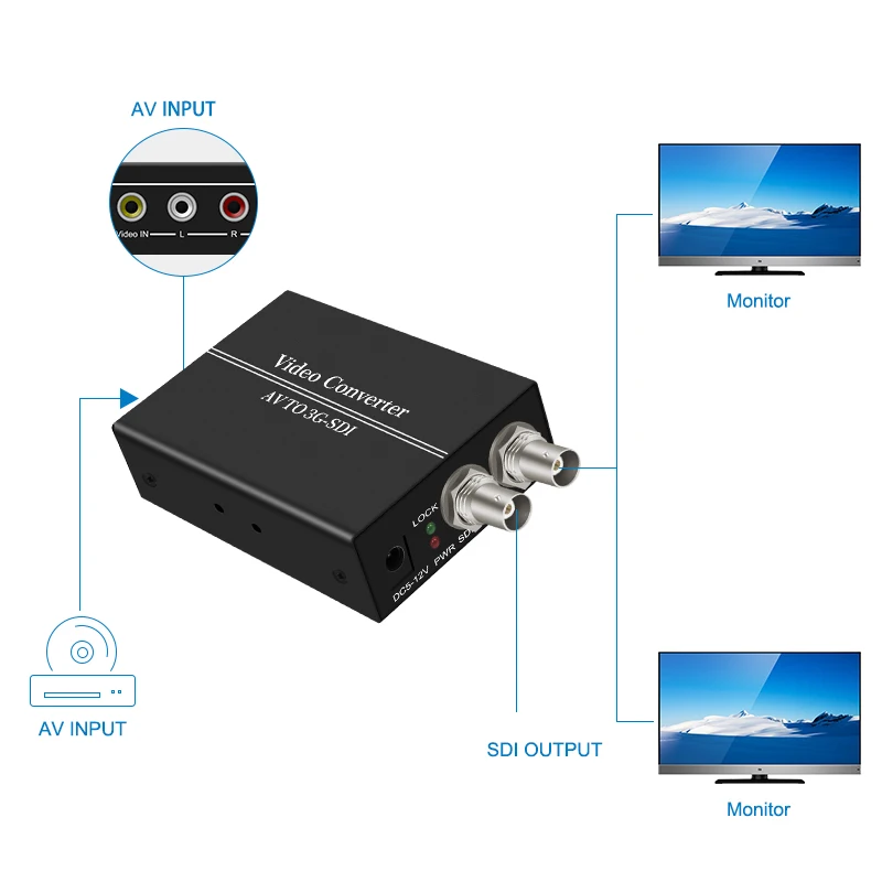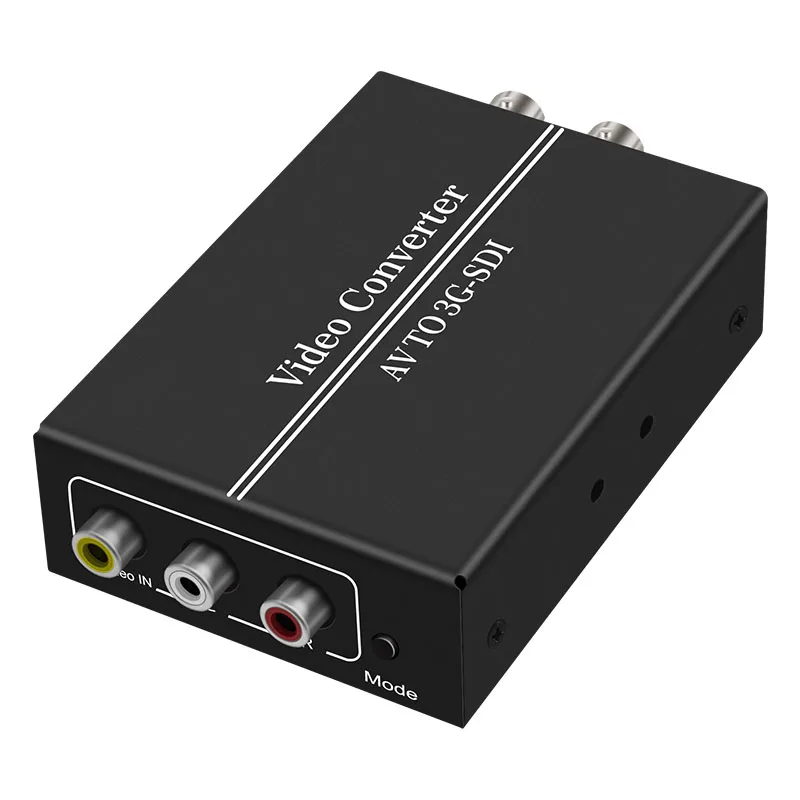 Píspectos:Puerto de entrada: 1x puerto AVPuerto de salida: 2x puerto SDI (puerto BNC)Voltaje de alimentación: CC 12 V.Consumo de energía: 5WResolución de entrada AV: 480i/ 576i/ 480P/ 576PResolución de salida SDI: 1280x720P 50/60, 1920x1080I 50/60, 1920x1080P 24, 1920x1080P 25, 1920x1080P 30, 1920x1080P 50/60Formato de salida SDI: 3G-SDI: SMPTE 424MHD-SDI: SMPTE 292MEl paquete incluye:1x convertidor de vídeo AV a SDI1x adaptador de corriente1x Manual de usuario
