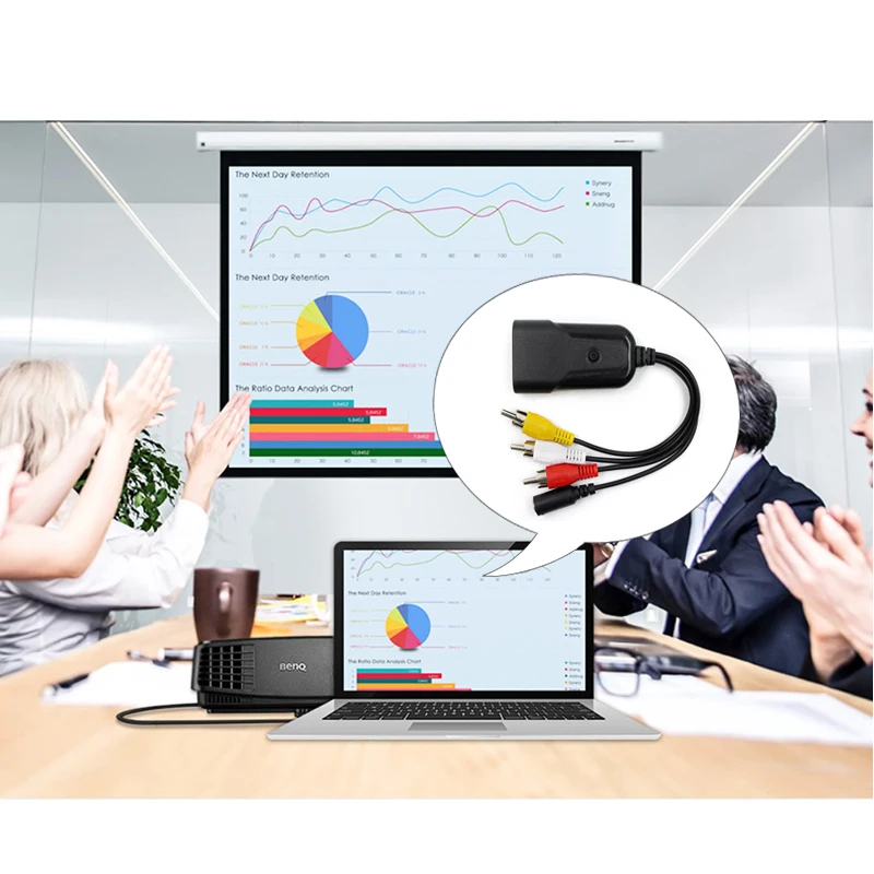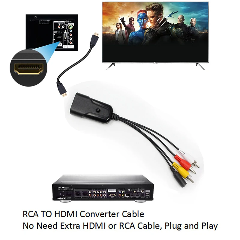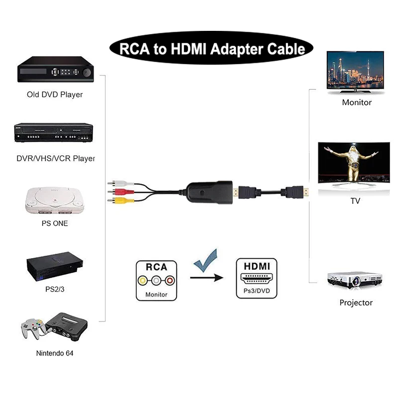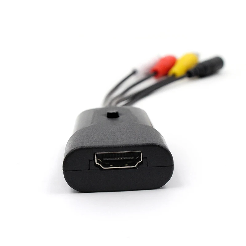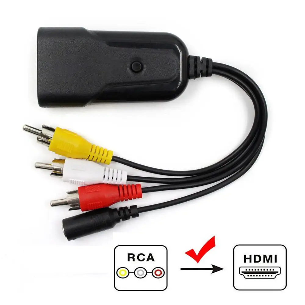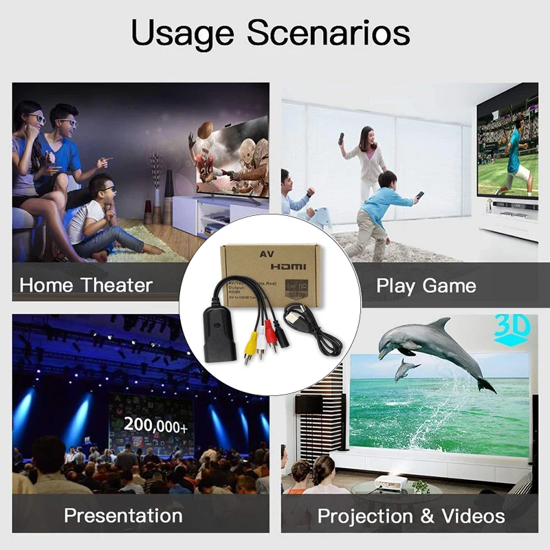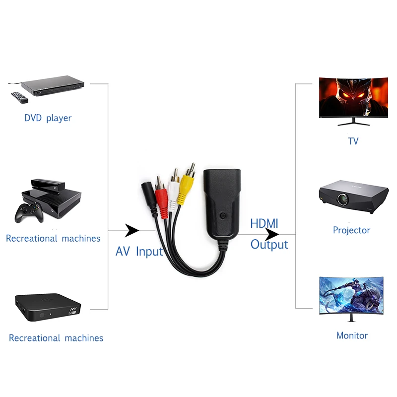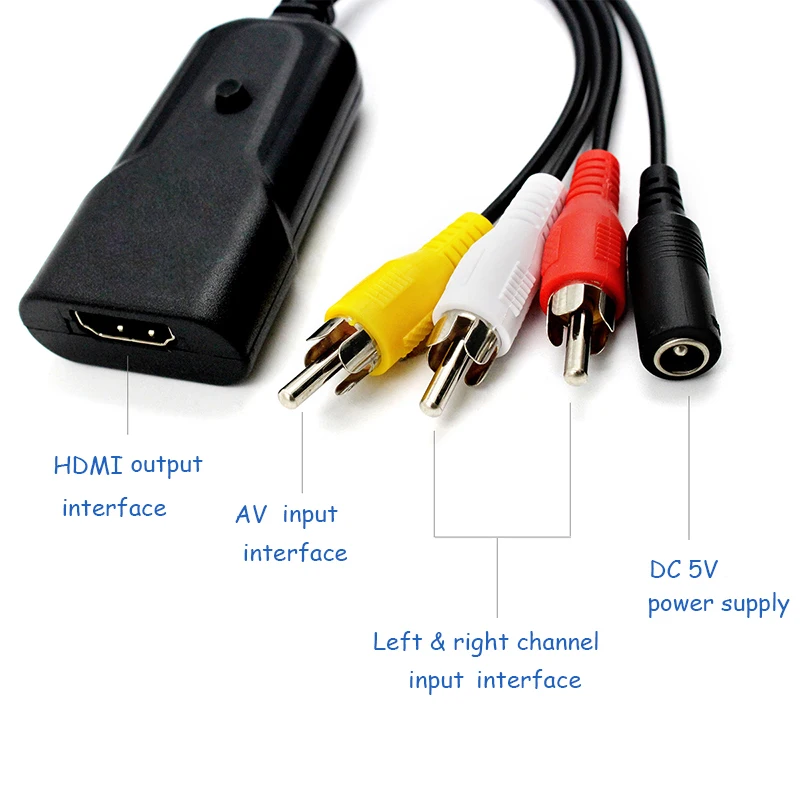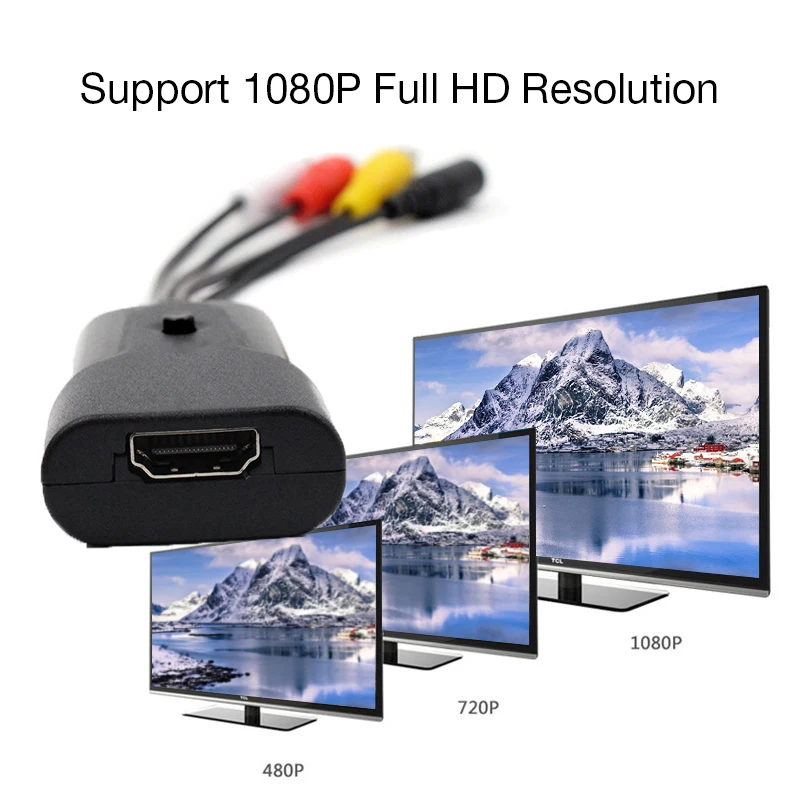 Description:This converter converts AV signal into HDMI signal, so you can watch your video on a modern TV with HDMI ports. It will auto-detect and auto-convert the composite signal to 720p/1080p(60HZ), Making video come alive, delivering the sharpest, most realistic HD visuals available.Features:★No need to install drivers, portable, flexible, plug and play.★Provide advanced signal processing with great precision,colors, resolutions, and deals;★Support PAL, NTSC3.58, NTSC4.43, SECAM, PAL/M, PAL/N standard TV formats input.★ Support HDMI 1080p or 720p output.Specifications:1. Input ports: 1 x RCA (Yellow, White, Red).2. Output ports: 1 x HDMI.3. Composite input: PAL, NTSC3.58, NTSC4.43,SECAM, PAL/M, PAL/N.4. HDMI output: 1080p60Hz, 720p/60Hz.Switcher:Switch the HDMI output resolution between 720p and 1080p.Note:1.Supported audio format: 2 channel analog audio, does not support 3D2.For converter to function properly all cables must be connected and in use (yellow: video, white: left audio, and red: right audio).What’s Included:1x Main Unit (Mini CVBS to HDMI converter)1x USB Cable
