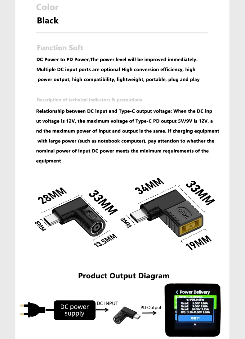¡Solo enchufe CC convertidor!Consejos: ¡¡¡La potencia de entrada debe ser ≥ la potencia de salida!!! Si su adaptador hembra es de 45W, como 19V2.37A, entonces la salida USB C PD es de 45W, no de 65W. Además, si su adaptador hembra es de 12V, entonces la salida tipo C es de 5V,9V,12V. no 20V.Por favor verifique cuidadosamente antes de realizar el pedido.Preguntas frecuentes: