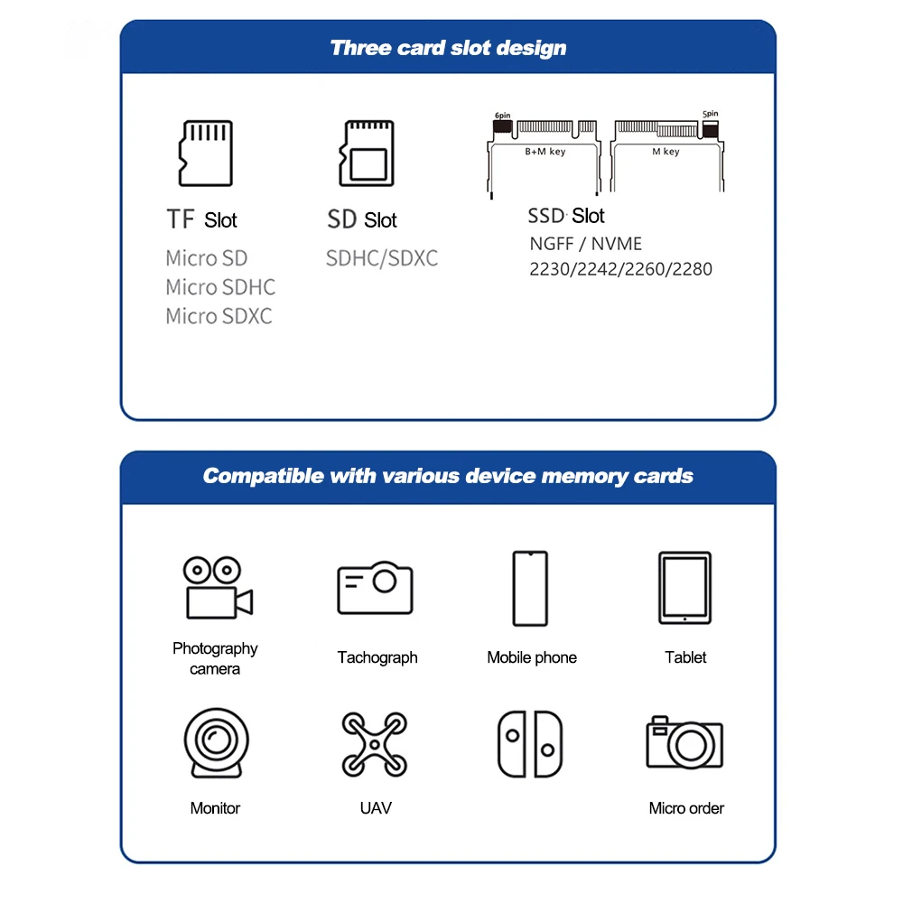 *Support M.2 NGFF/NVME SSD SD SD TF card, compatible with various device memory cards