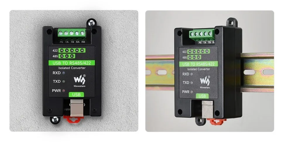 Adopta la solución de chip FT232RNL y SP485EEN original, proporciona una comunicación estable con aislamiento galvánico incorporado, protección a prueba de rayos y antielectrostática, etc. Es una opción ideal para equipos de control industrial y/o aplicaciones con altos requisitos de comunicación.
