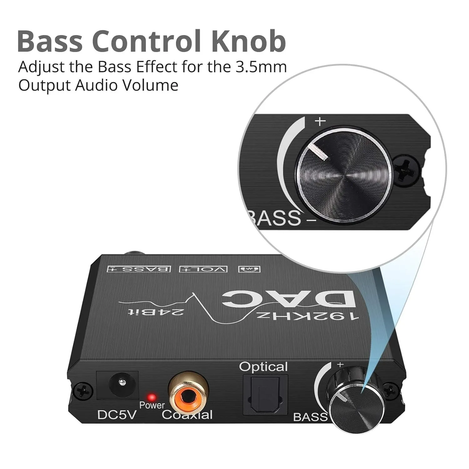 Este producto está diseñado para señales de audio profesionales. Puede convertir fácilmente la interfaz Coaxial o Toslink a una interfaz de audio analógica RCA y un conector para auriculares de 3,5 mm.El chip amplificador de audio profesional y la perilla de ajuste de volumen están diseñados para controlar directamente los auriculares y ajustar el volumen de salida.El producto también diseñó una perilla de ajuste de graves, que puede controlar fácilmente el componente de graves para satisfacer las diferentes necesidades de los clientes.