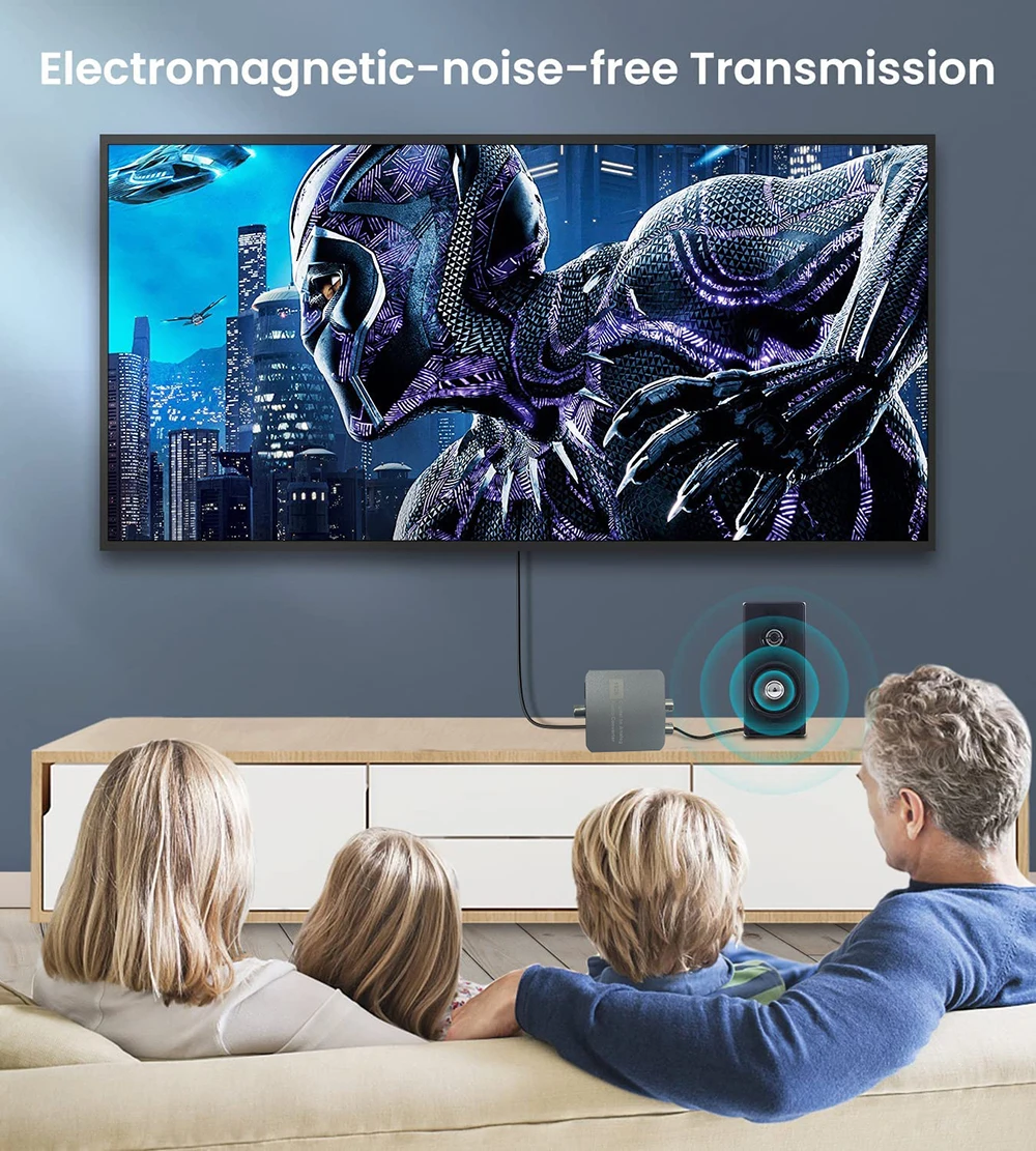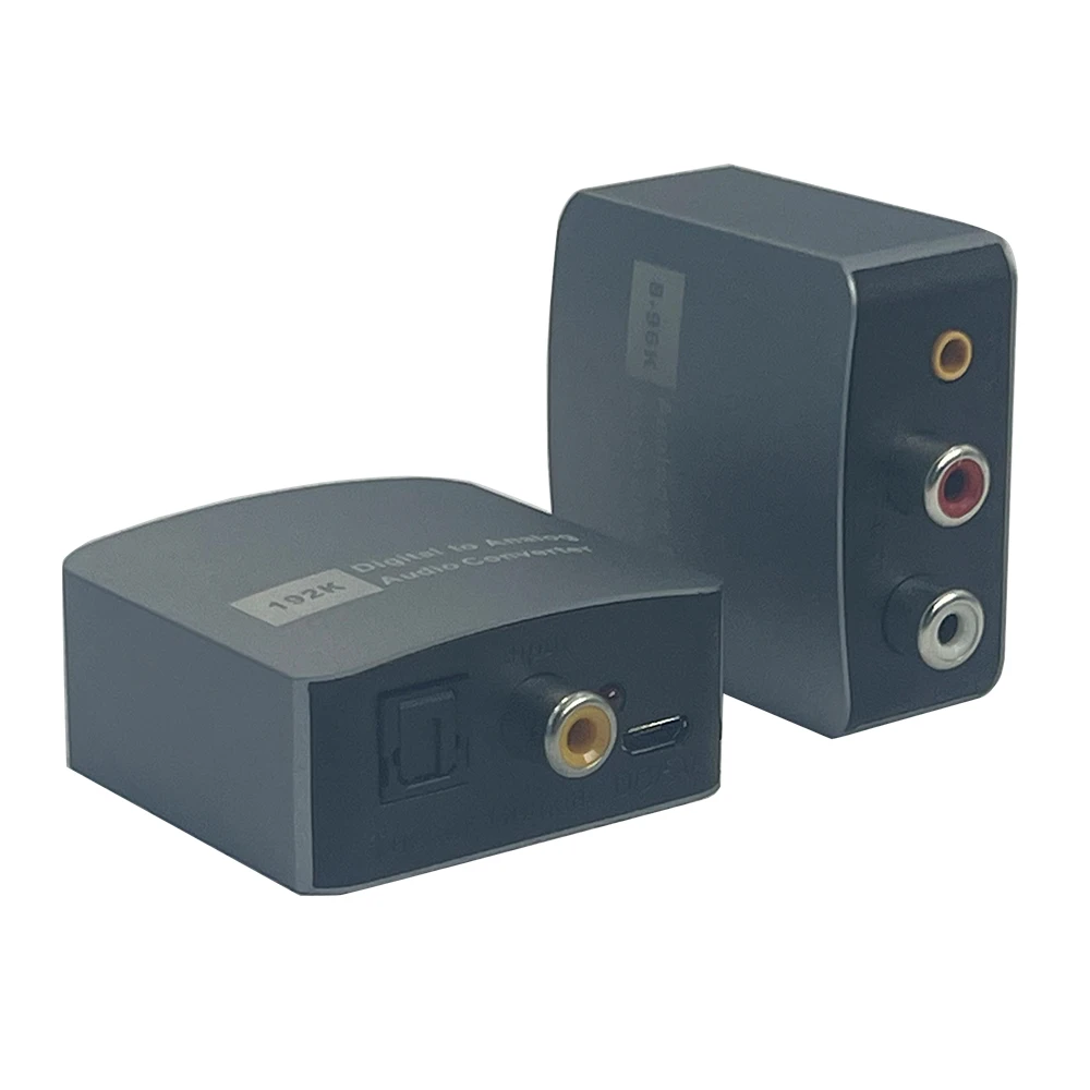 Este convertidor de audio digital a analógico convierte las señales de audio digitales coaxiales o digitales ópticas (Toslink) en señales de audio analógicas estéreo para la conexión a un dispositivo externo, como un amplificador, utilizando cables de audio RCA estándar.