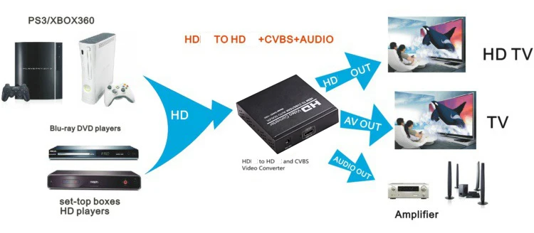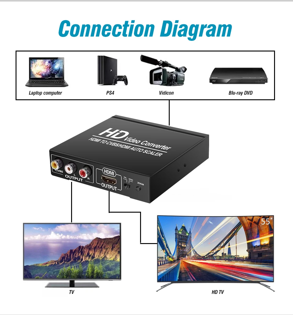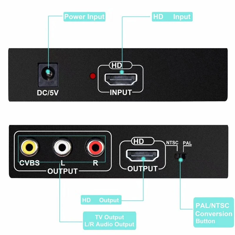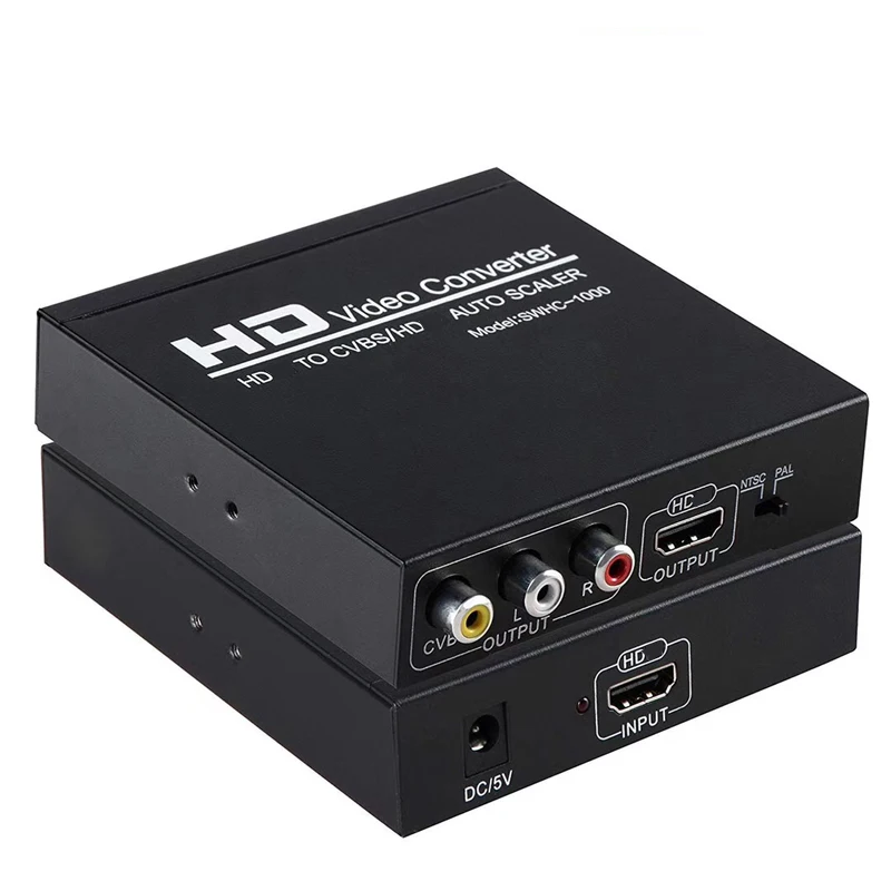 Señal de video o señales compatibles con HDMI; Ayuda a los usuarios a convertir la señal de video compatible con HDMI de alta calidad En señal CVBS normal (definición estándar 480i, 576i). Para que pueda reproducir en la TV, VHS VCR, grabadoras de DVD, etc. Compatible con los dos formatos de TV NTSC y PAL.