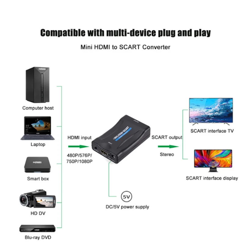 NOTA: Este es un convertidor unidireccional, solo transmite señal de SCART a compatible con HDMI, NO PUEDE de compatible con HDMI a SCART.