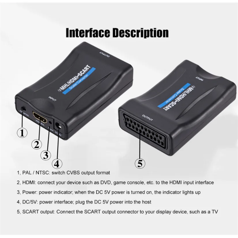 Entrada SCART: Utilice un cable compatible con Scart a HDMI para conectar su dispositivo SCART a este convertidor. Como para DVD, Sky Box, STB, etc.