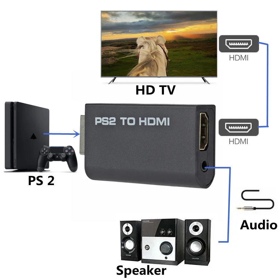 El paquete incluye: 1 convertidor PS2 a HDMI 1xcable de alimentación USB Descripción: Juega a juegos de PS2 en modernos televisores y monitores HD con Este convertidor HDMI. Las resoluciones admitidas son: 480i, 480p y 576i. (Funcionará en todos los televisores HDMI) El convertidor está alimentado por USB, por lo que puede usar el cable USB suministrado para conectar al puerto USB frontal de las consolas para alimentarlo. Características: Juegue a juegos de PS2 en televisores y monitores con HDMI en sonido y video digital completo Resoluciones compatibles: 480i, 480p y 576i Se conecta directamente al enchufe de salida AV PS2 Conector de audio estéreo separado de 3,5mm para auriculares Fácil de configurar y usar tu PS2 con un equipo moderno