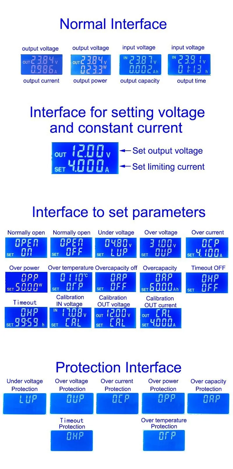 5,5. Configuración de los parámetros de protección en estado y umbral: Mantenga presionado U/I para ingresar la interfaz de configuración de parámetros en la interfaz normal. Presione SW hasta que aparezca la protección que desea. LUP: umbral de protección contra subtensión; OUP: umbral de protección contra sobretensión; OCP: umbral de protección contra sobrecorriente; OPP. Umbral de protección de energía; OAP -- umbral de protección de ultra-Capacidad; umbral de protección de tiempo de espera OHP; OTP -- Umbral de protección contra sobretemperatura. Pulse brevemente rotar el codificador para seleccionar qué bit desea configurar el parámetro de protección. Mantenga presionado el codificador rotatorio para configurar o apagar los parámetros de protección (solo tiempo de espera La protección y la protección de supercapacidad se pueden configurar para activar/desactivar, y otros parámetros de protección están activados de forma predeterminada). Gire el codificador hacia la izquierda y hacia la derecha para que los parámetros sean más grandes y más pequeños. Después de la configuración, mantenga presionado U/I para volver a la interfaz normal.