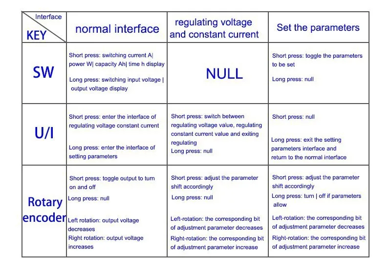 5,3. Configure el valor de corriente constante (es decir, el valor máximo de corriente permitido a la salida por el módulo) -- presione el botón U/I en la interfaz normal para ingresar la interfaz de corriente constante de voltaje de configuración. Luego presione el botón U/I y cambie a la configuración de valor de corriente constante. Puede ver un poco de la configuración del valor de corriente constante parpadeando. Gire el codificador rotatorio hacia la izquierda y hacia la derecha para ajustar el mayor y el menor. Presione brevemente el codificador rotatorio para elegir qué bit establecer el valor de corriente constante. Después de configurarlo, pulse U/I para salir de la interfaz de corriente constante de voltaje de configuración y volver a la interfaz normal. O vuelve automáticamente a la interfaz normal después de detener el funcionamiento durante 10s.