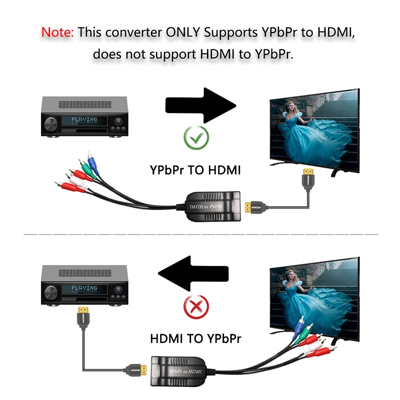 El convertidor YPBPR a HDMI que convertirá la señal de vídeo YPBPR y las señales de audio estéreo FL/FR en señal de vídeo HDMI.Para ayudar al usuario a obtener la alta calidad de la señal de vídeo HDMI de la señal YPBPR.Para que pueda reproducirse en TV BOX, VHS, VCR, grabadoras de DVD, etc. y admitir el televisor con puerto HDMI.