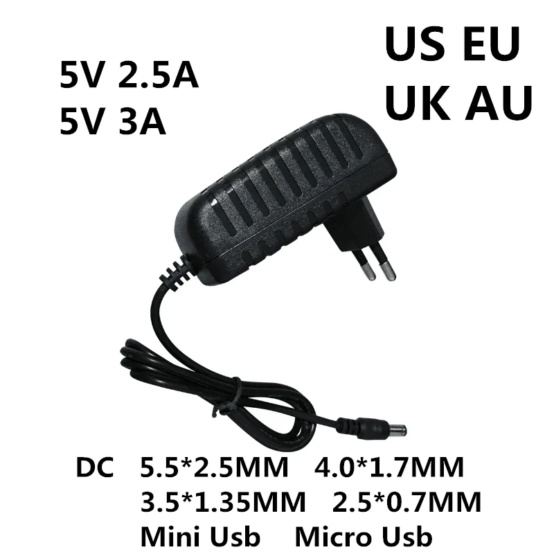 Parámetros de red y otras instrucciones Fuente de alimentación universal, transformador de potencia de conmutación El voltaje de suministro está dentro del rango apropiado de necesidades 4,8 V-5,2 V, demanda de corriente en el dispositivo 2a o 2a Alimentación de CC aplicada a los requisitos eléctricos Placa DE DESARROLLO 5V 2a, disco duro móvil, etc. El voltaje de suministro es adecuado para todo tipo de necesidades 5V 2A o 2A siguiendo los productos de entrada de corriente CC, ¡sin operación de sobrecarga! Es La atención selectiva de potencia a seguir de acuerdo con seleccionar el voltaje y la corriente que es igual o mayor que la corriente eléctrica a la potencia requerida Voltaje de entrada (ENTRADA): 100-240V 50-60Hz Voltaje de salida (salida): CC 5V 0.5A,1A,2A,2.5A,3A Salida (potencia máxima): 2,5 W/5W/10W/12,5 W/15W Forma: como las siguientes imágenes son mapa físico longitud 1m Polaridad: El interno es positivo y el externo es negativo. Enchufe de CC: 5,5*2,5 MM, 4,0*1,7 MM, 3,5*1,35 MM, 2,5*0,7 MM,Micro Usb,Mini Usb Para otros tipos de energía, es necesario ponerse en contacto con el propietario Gracias por la energía constante Lancashire, le deseo una feliz compra.