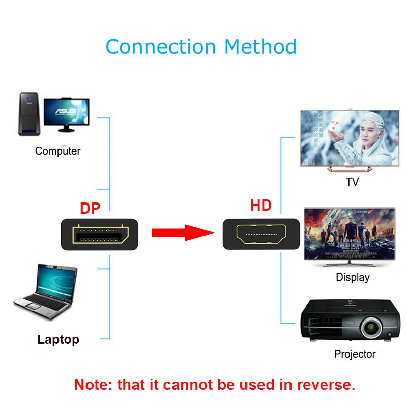 Tenga en cuenta: el puerto hembra DP SOLO conecta el ordenador/portátil, el puerto macho HDMI SOLO conecta con la TV/Pantalla/Proyector. La conexión inversa no funciona.Característica: